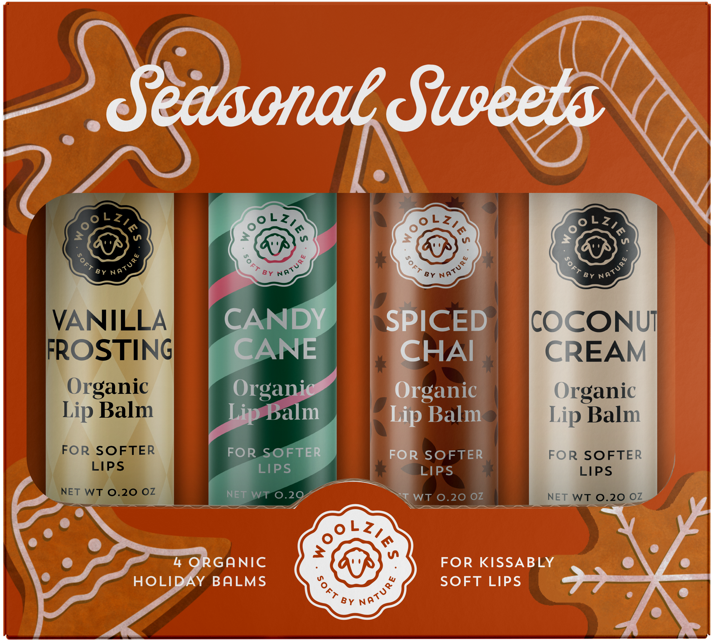 Get kissably soft, healthy lips and seal in moisture with our healing formula. This set of 4 includes Vanilla Frosting, Candy Cane, Spiced Chai, and Coconut Cream Lip Balms.
