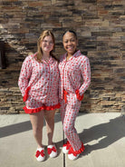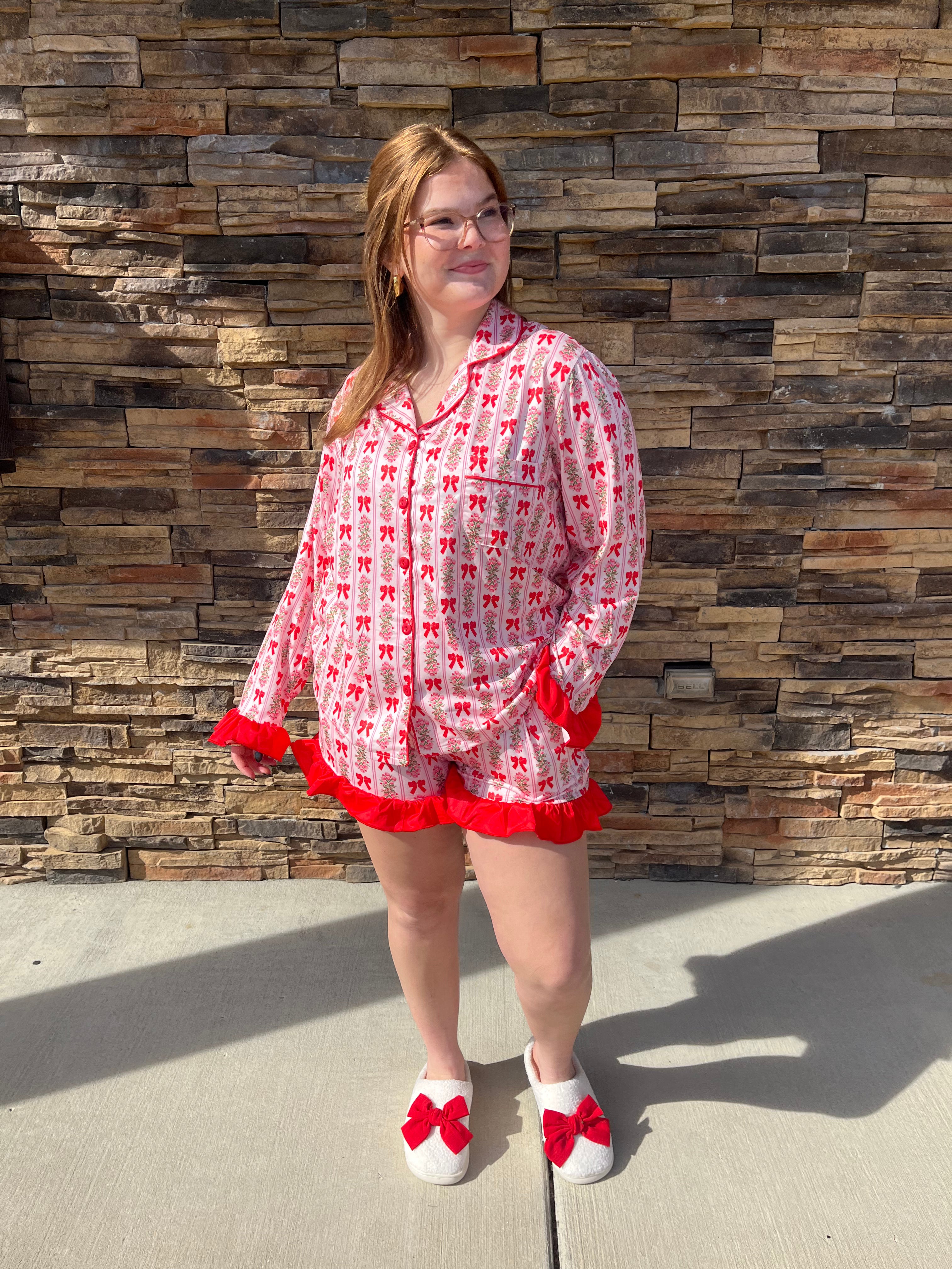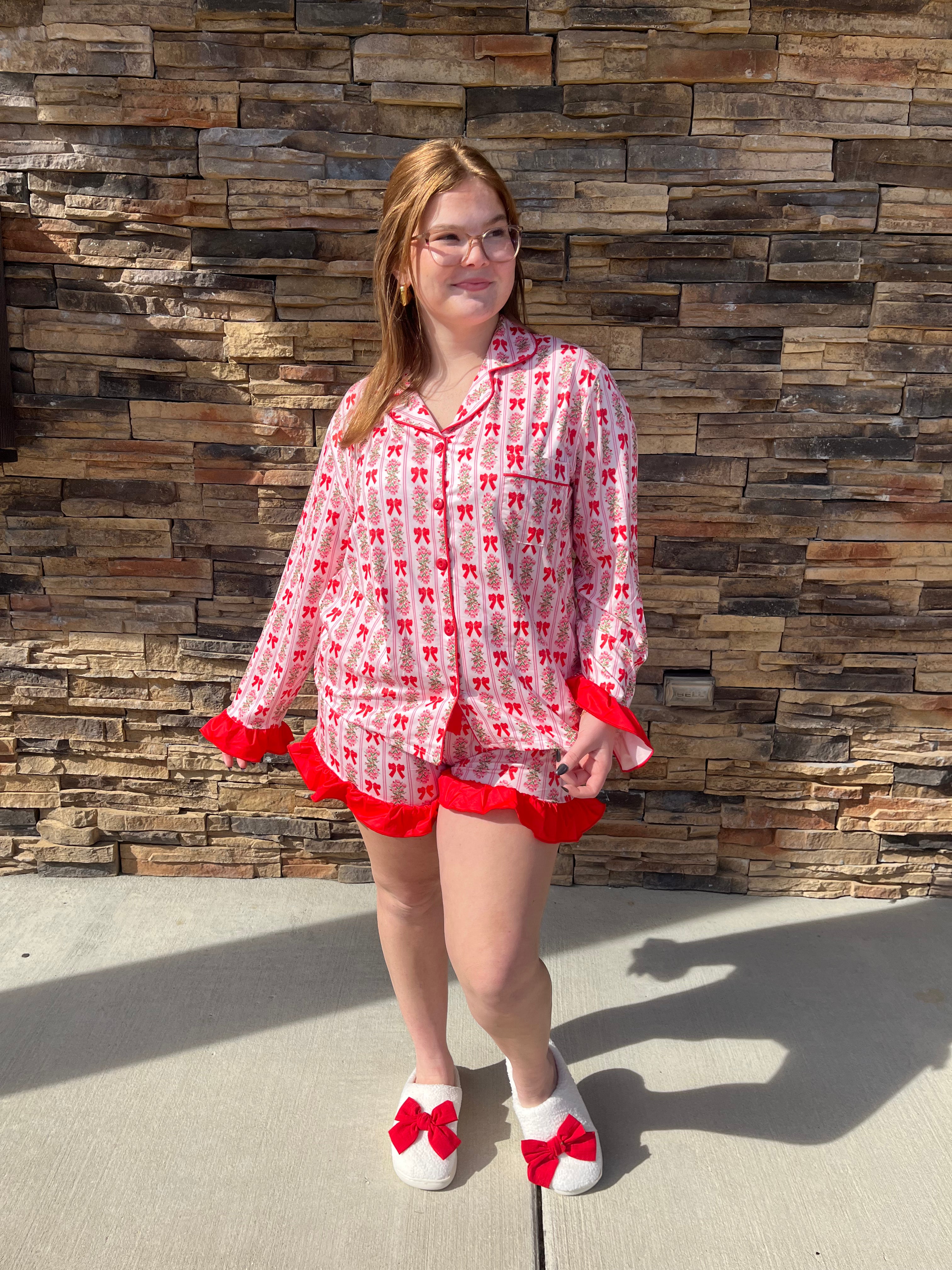 Unwrap comfort with our Sweet Dreams Pajama Sets. Soft, stretchy, and irresistibly cozy, these festive favorites come in two charming styles: long sleeve with pants or a long sleeve with shorts. Whether you're winding down or waking up, the relaxed fit and ultra-soft fabric make every moment feel a little more special. Finished with a pretty ribbon tie, each set comes ready to gift—no wrapping required. Available in two styles: long sleeve + pants or long sleeve + short sets Carefully folded and tied with a ribbon for a pretty, secure package Relaxed fit and all-night comfort, sizes small-extra large Ultra soft blend for cozy stretch and comfort: 95% polyester, 5% spandex Machine washable and easy care for everyday coziness