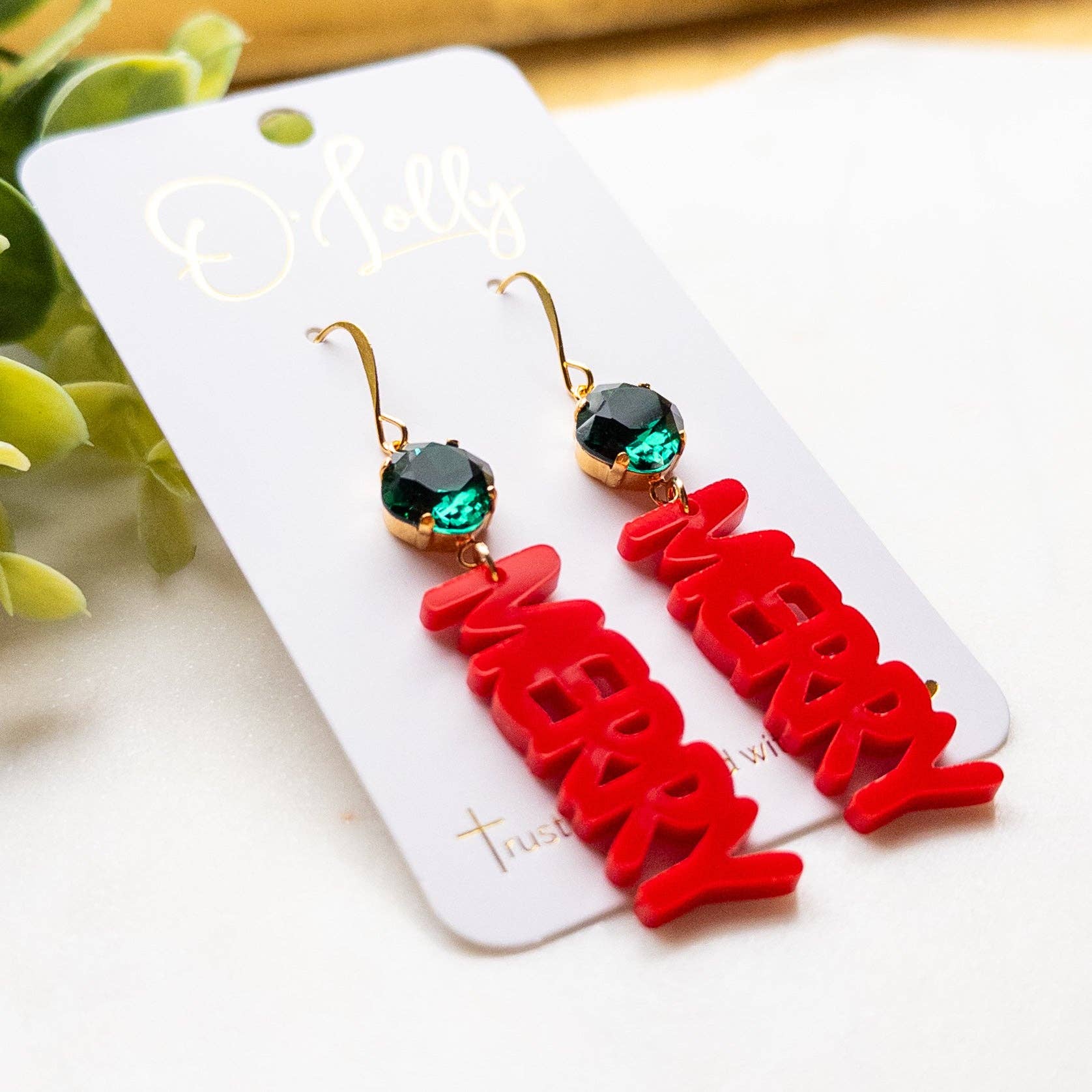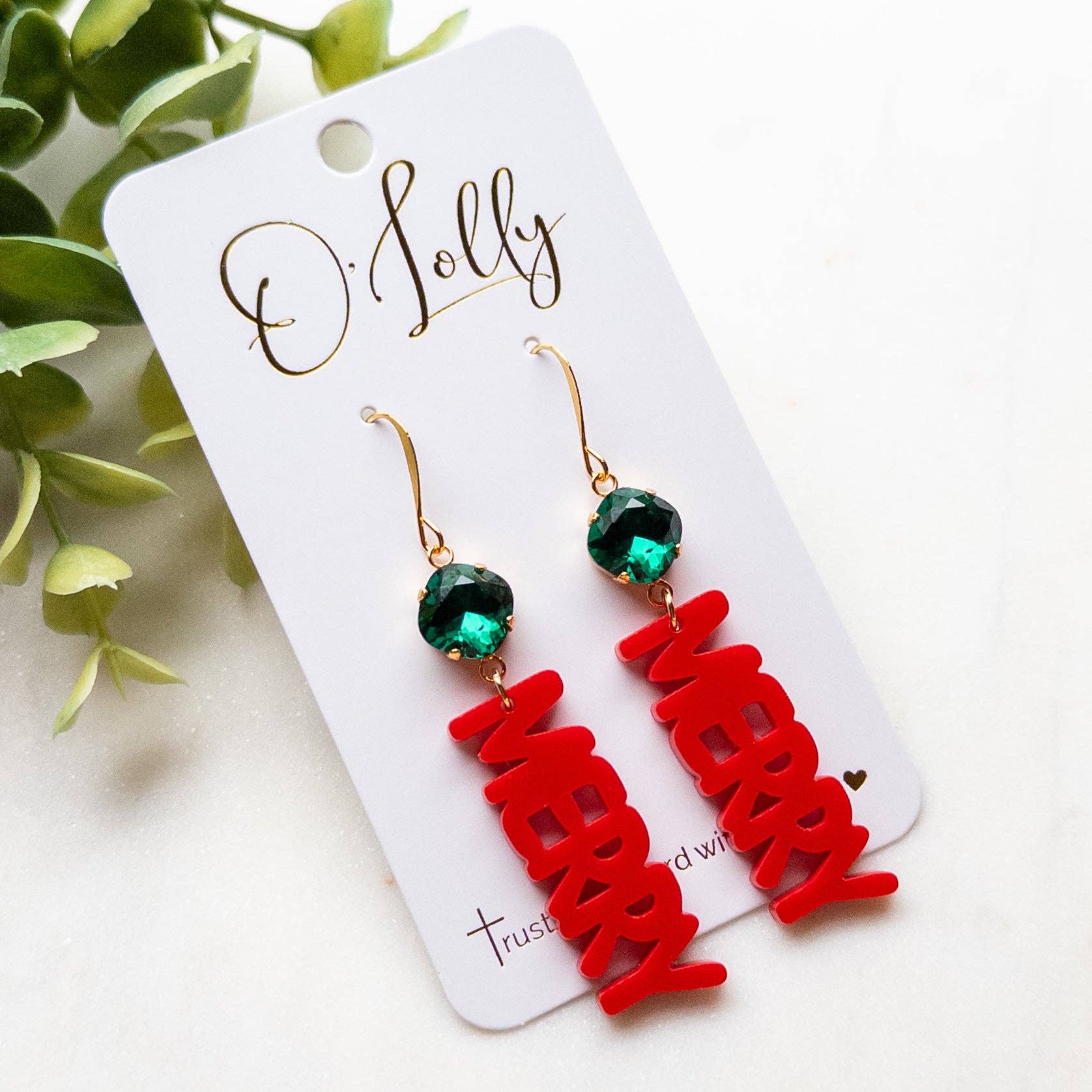 Elevate your holiday style with our Red MERRY Christmas Earrings featuring a vibrant green stone. These festive earrings are 2.75 inches long and will add the perfect touch of Christmas cheer to any outfit. Make a statement while spreading joy this season.