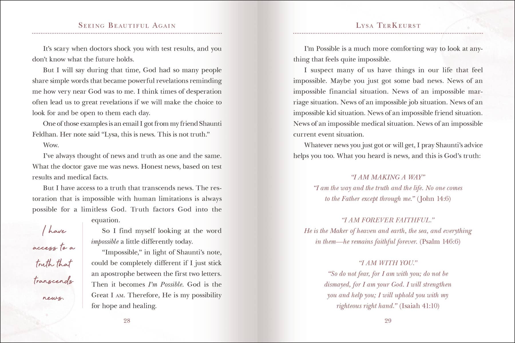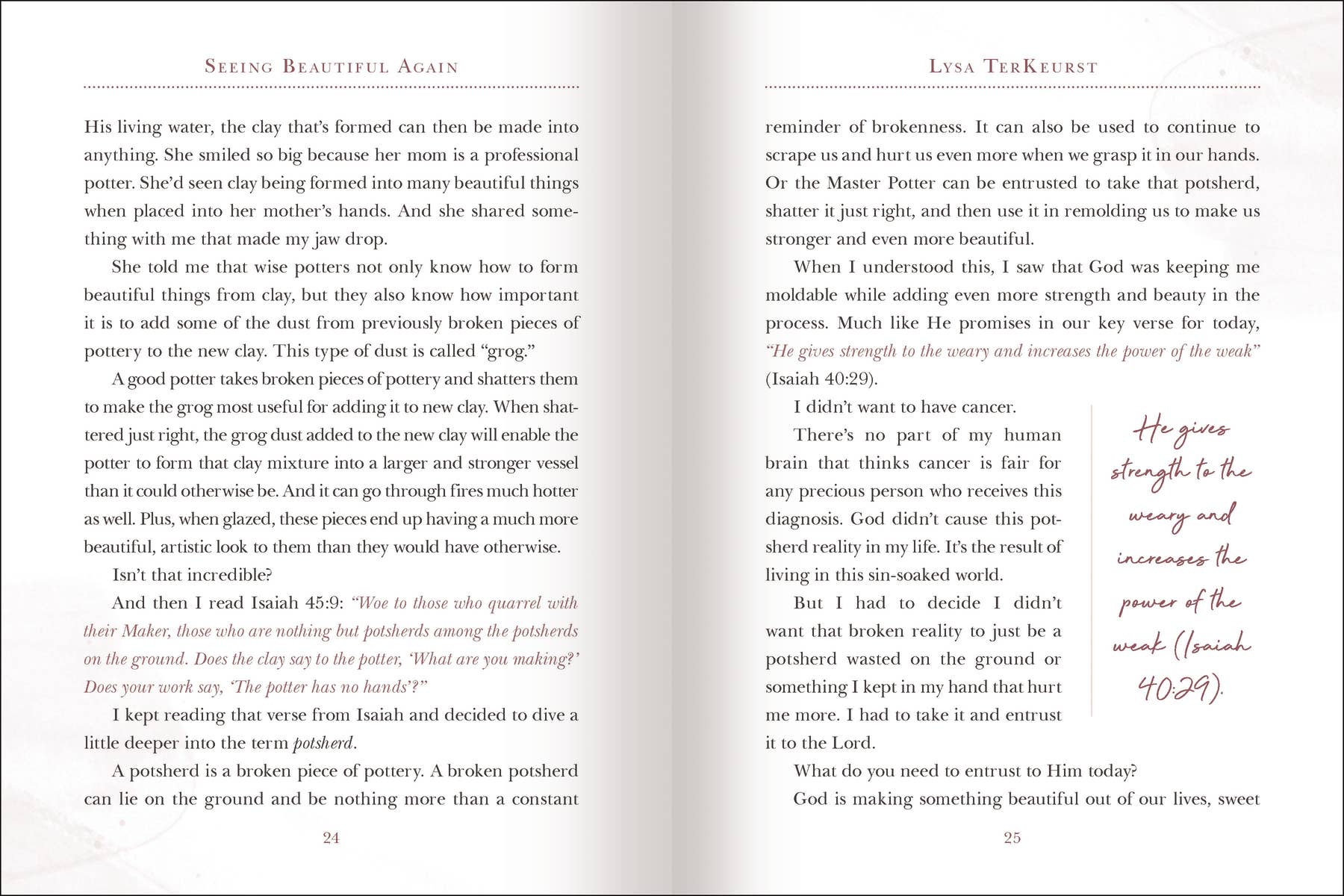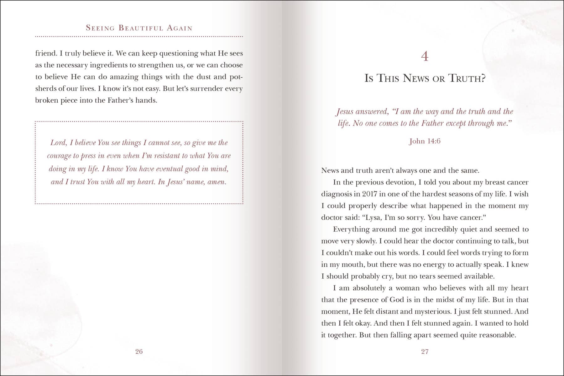 • Hardcover • 2-Color Feel God breathe life into the shattered pieces of your story as he creates something new and more beautiful. In the middle of the pain you didn't cause, the change you didn't want, the reality you didn't know was coming . . . your life can still be beautiful. We all have stories full of sorrow and celebration. But with God, there's always more going on than what we see. New York Times bestselling author Lysa TerKeurst encourages you to hope again through 50 devotions that will help you find redemption in every part of your story. Lysa, president of Proverbs 31 Ministries, assures us that the aching pain we feel is proof there's a beautiful remaking already in process if we don't give up. Through these 50 devotions, Scriptures, prayer prompts, and personal notes from Lysa, you will: • Gain healthier ways to process your pain • Learn to see your situations through truth-based perspectives • Disempower the lie that how you feel about your life is the full story.