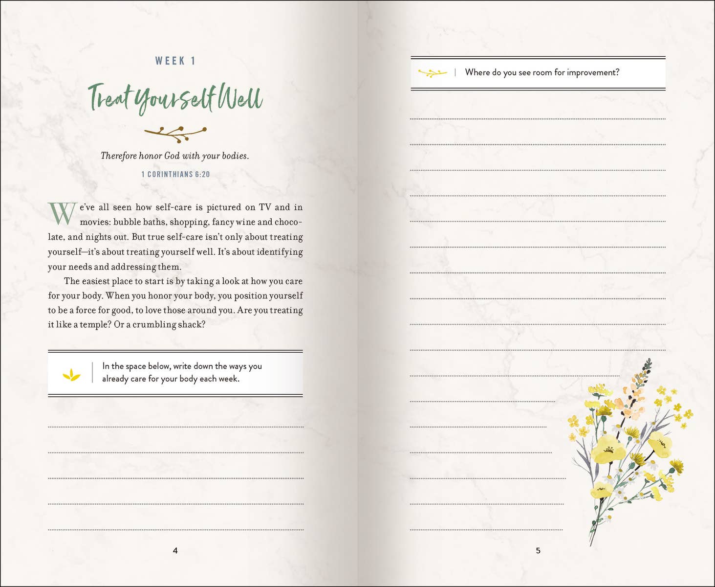 • The Weekly Self-Care Project is a year-long guided journal that weaves together Scripture verses, thoughtful questions, gorgeous watercolor and photography, practical self-care ideas, and mindful reflections to help you make life-giving choices spiritually, emotionally, and physically--all year long.