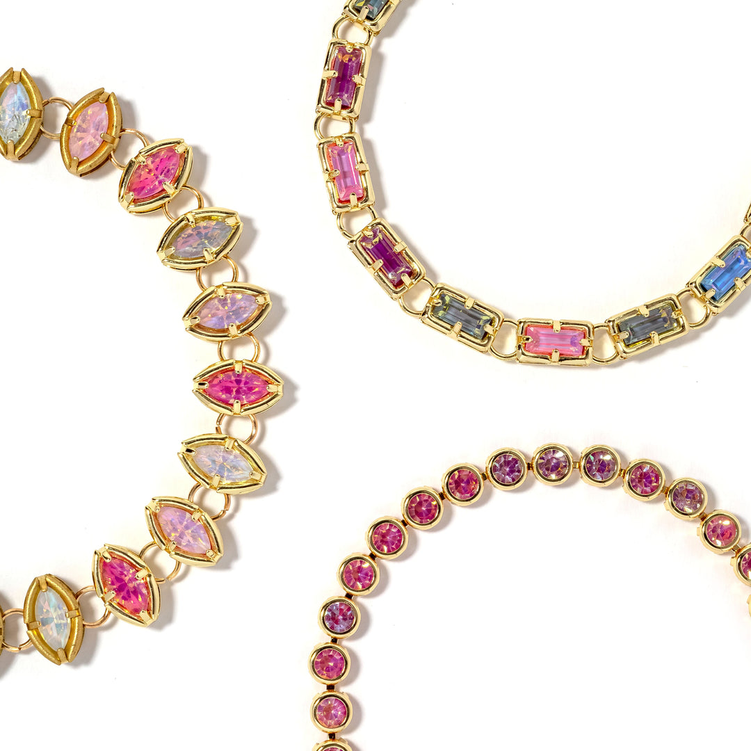 Discover understated luxury with the Erimish Hollis Stack, a sophisticated three-piece bracelet collection in soft pink tones. Each bracelet showcases radiant crystal stones nestled in delicate gold plating, allowing you to mix and match for endless styling possibilities. Wear them stacked together for maximum impact or individually for subtle elegance. The faceted stones catch and reflect light beautifully, creating a luminous glow that complements any occasion. Perfect for layering or standalone wear, this versatile set brings refined sparkle to your everyday style.