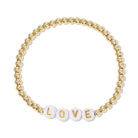 LOVE (white circles with gold/bronze lettering) on 4mm gold beaded stretch bracelet. Spread love with this stretch bracelet, featuring gold beads and the word LOVE on white rounds. A stylish way to express your affection (and sense of style) with every outfit! Stretch Bracelet Approximately 6.5" 18k Gold Plated Brass Base Plastic Letter beads
