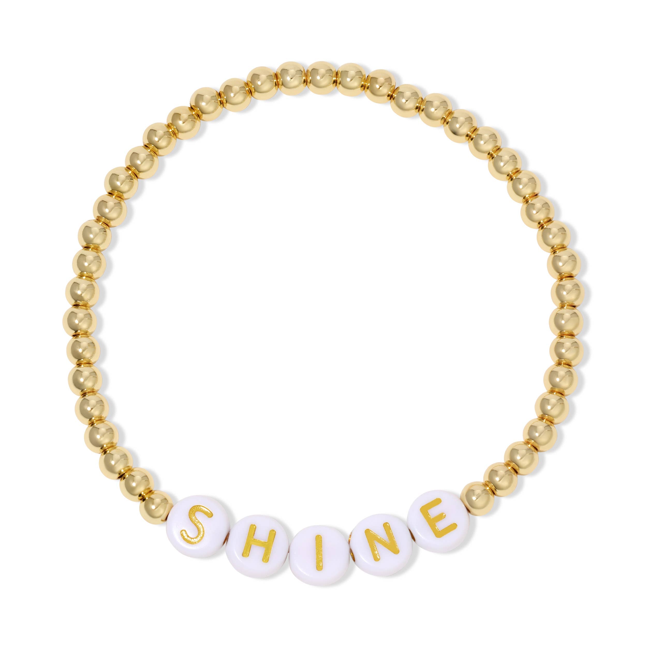 SHINE (white circles with gold/bronze lettering) on 4mm gold beaded stretch bracelet. Add some sparkle to your day with this 4mm beaded bracelet featuring the word SHINE on round white plastic beads. Let your light shine bright! Stretch Bracelet Approximately 6.5" 18k Gold Plated Brass Base Plastic Letter beads