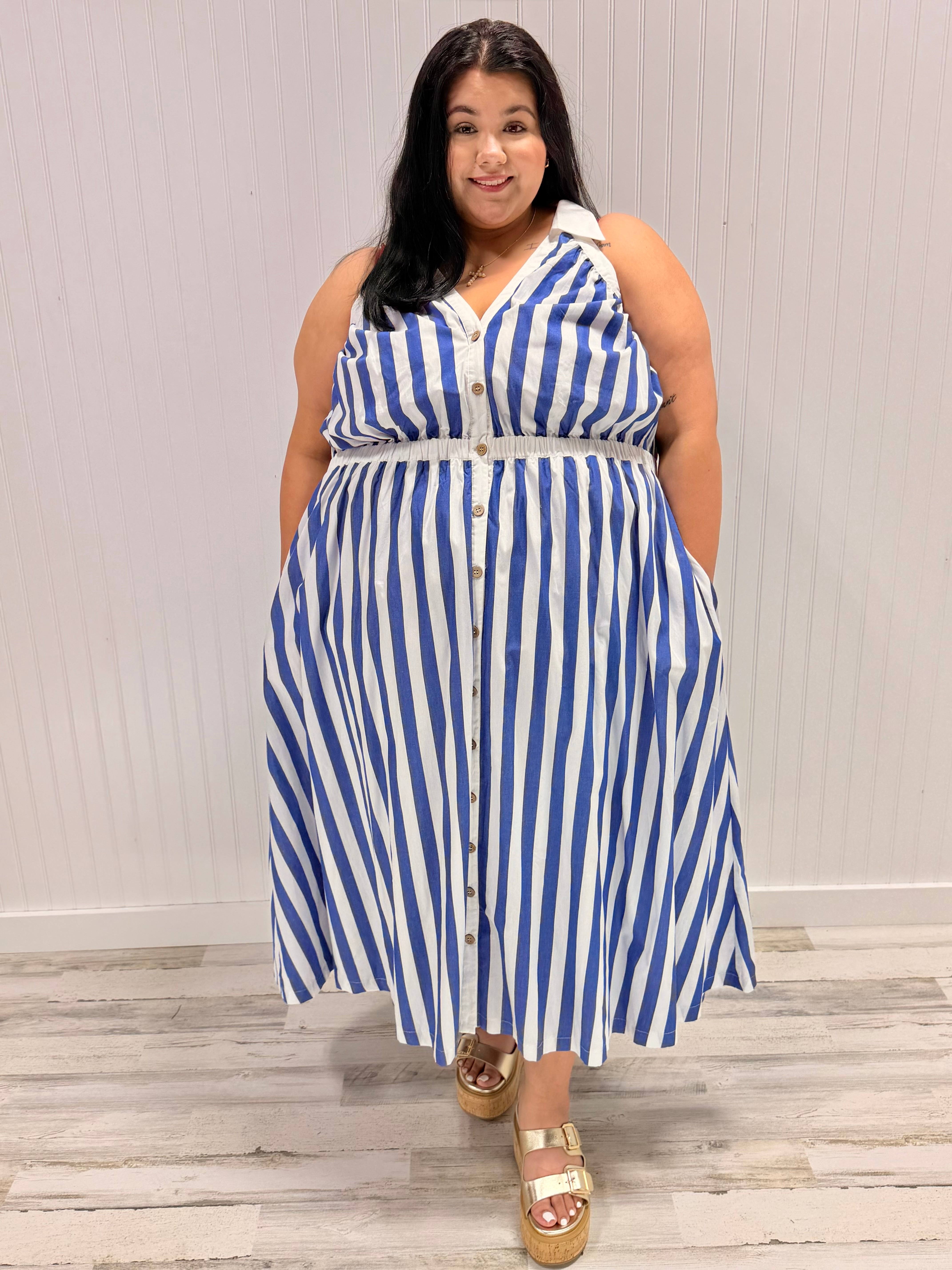 Meet the Ellison Dress—your new go-to for effortless style! This charming striped midi features a crisp collar, flattering V-neckline, and convenient button-down front. The elasticized waist cinches just right while the full skirt swings with every step. Crafted from 100% cotton with a polyester lining for comfort and durability, it's the perfect blend of classic and carefree. Approximately 56" in length.