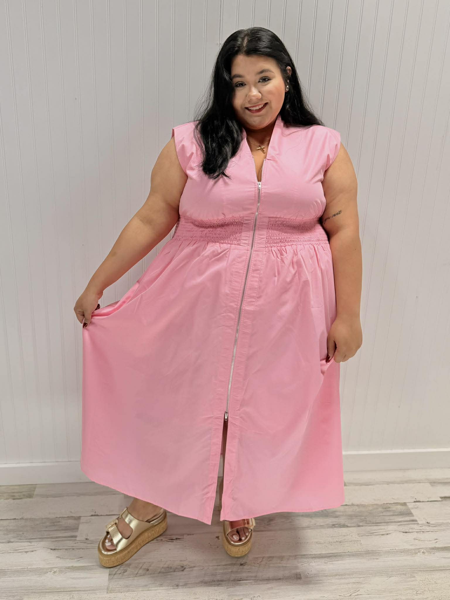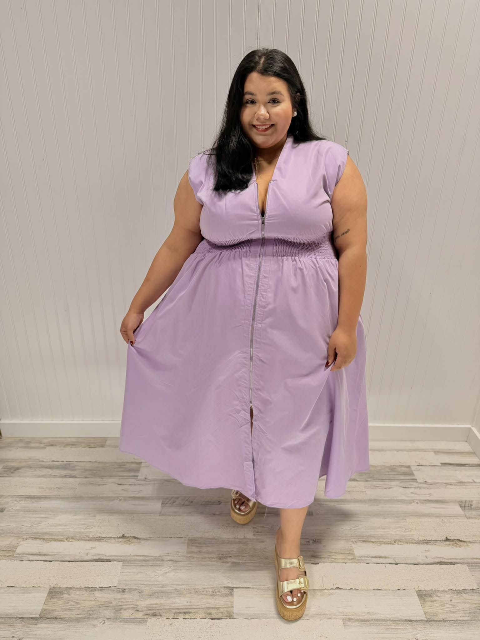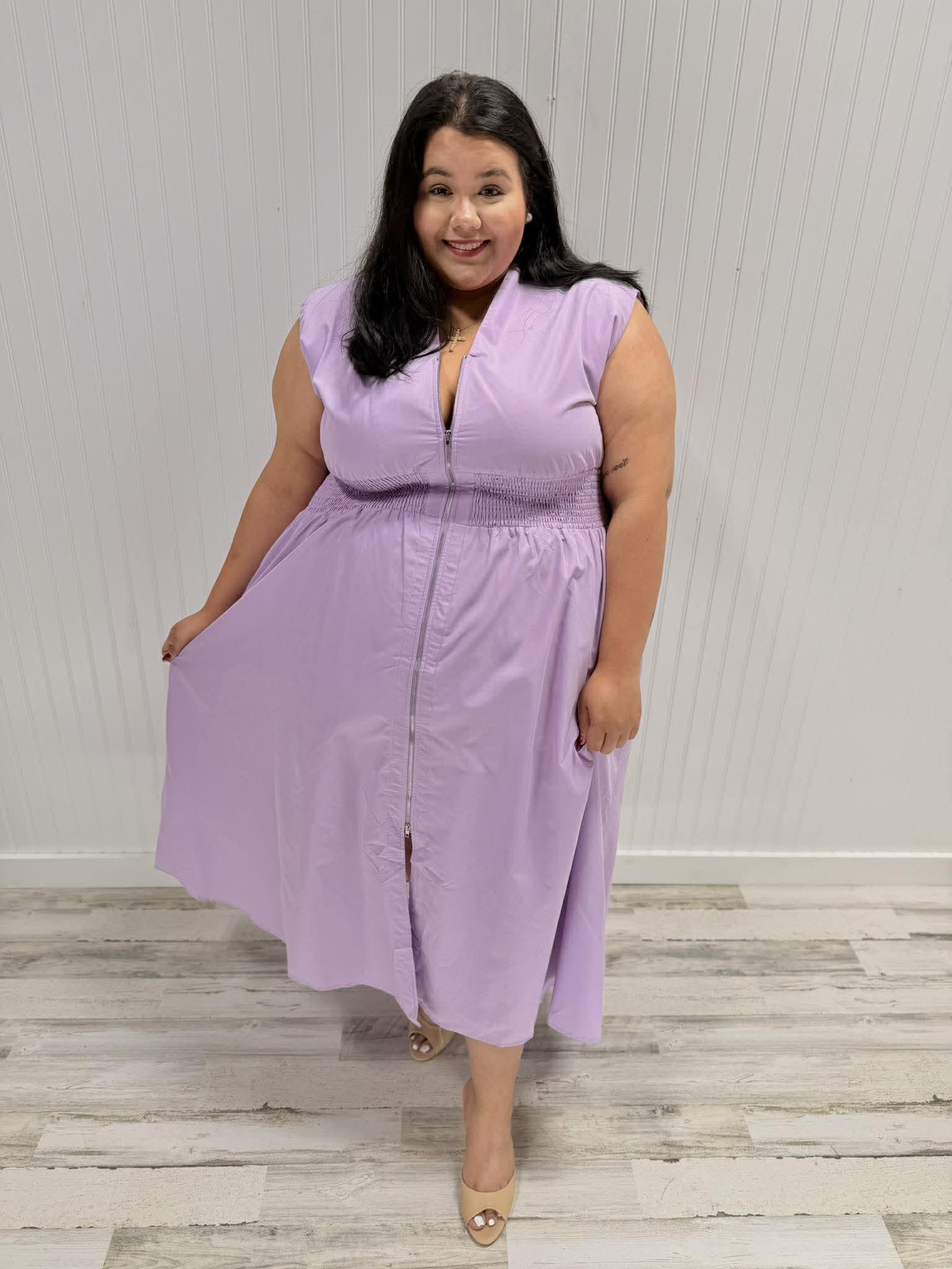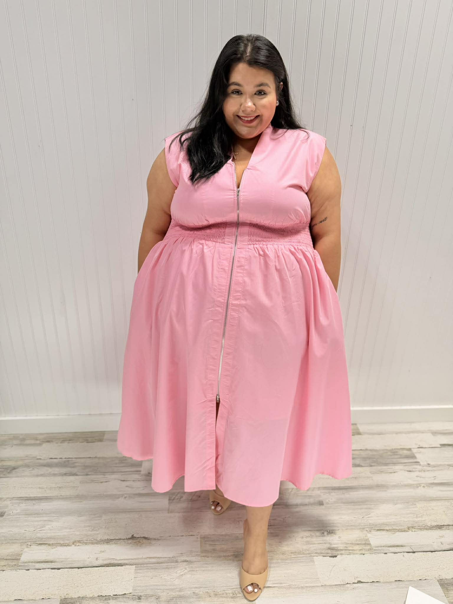 Rock a look that's as versatile as you are! This sleeveless stunner features a flattering smocked waist that hugs you just right, plus a genius two-way zipper for easy on-and-off vibes. The lined interior keeps everything smooth and comfortable all day long. Crafted from a stretchy poly-spandex blend (85% polyester, 15% spandex), it's designed to move with your body and bounce back for repeat wear.