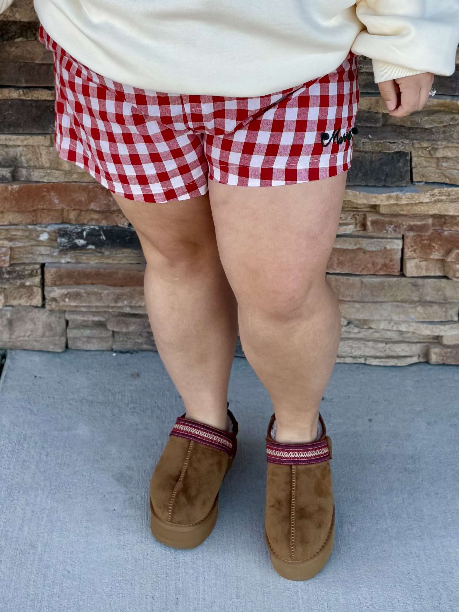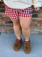 Get festive with the Curvy Peyton Shorts! These adorable Christmas gingham shorts bring holiday cheer to your seasonal wardrobe with their classic red pattern. The "merry" embroidery on the left leg adds a fun, spirited touch that says you're ready to celebrate. Cozy, cute, and perfect for holiday gatherings, casual parties, or spreading joy wherever you go—because Christmas style should always be this playful!