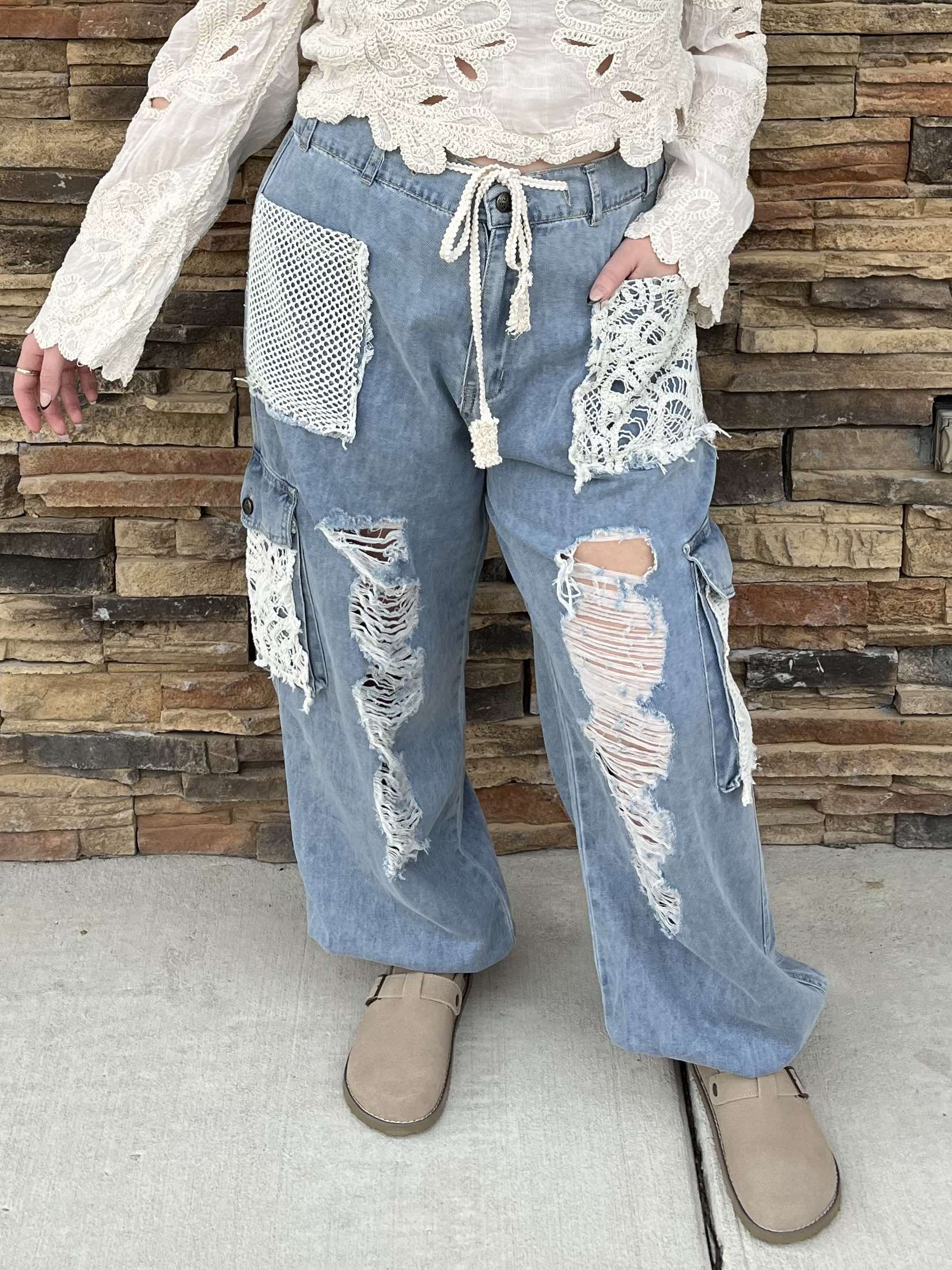 Step out in style with the Maggie Pants—lightweight distressed denim crafted for comfort and attitude. These jogger-fit pants blend casual ease with chic lace details, adding a flirty twist to your everyday look. Perfect for those who like their fashion with a side of fun and a touch of edge.