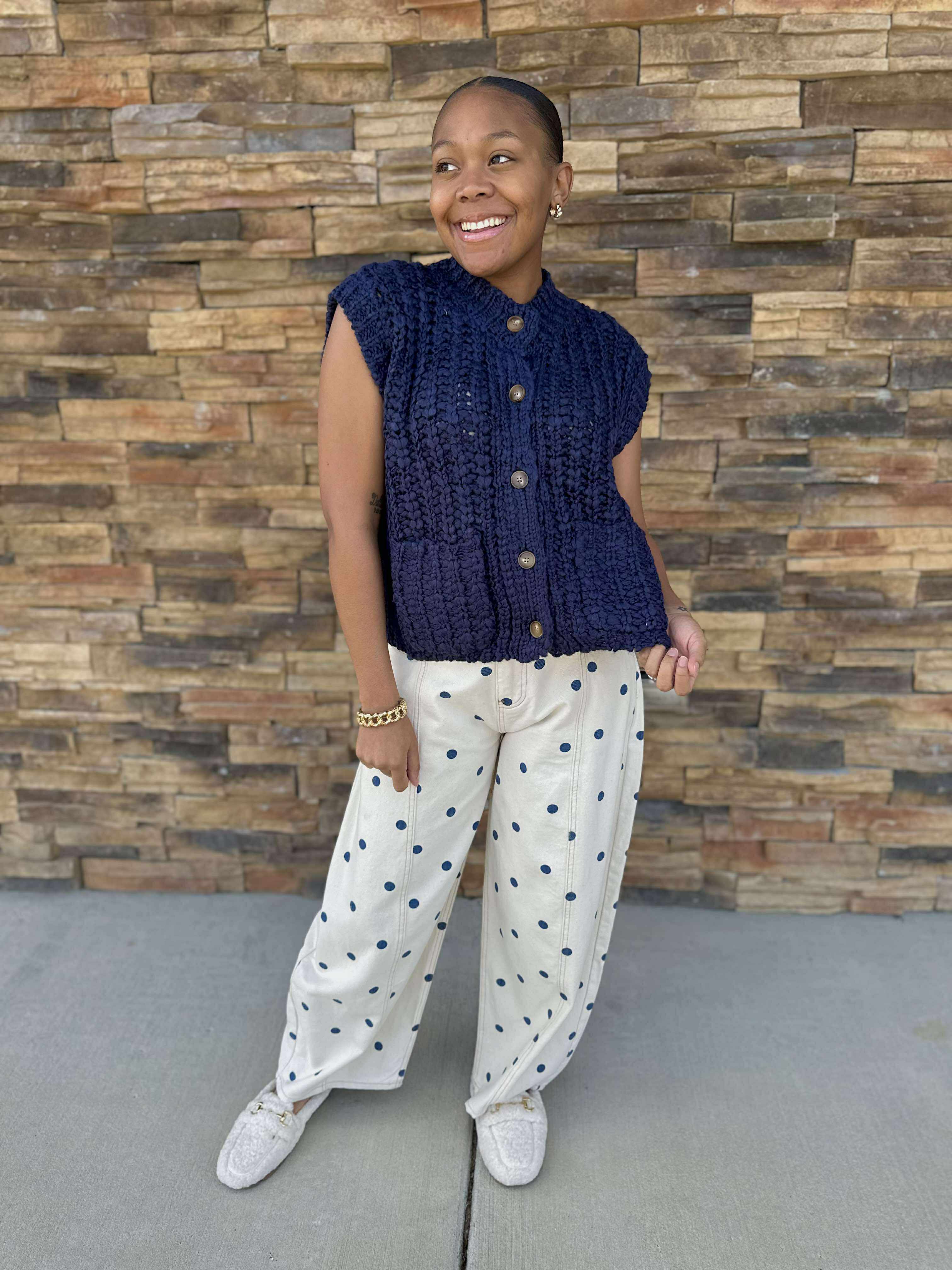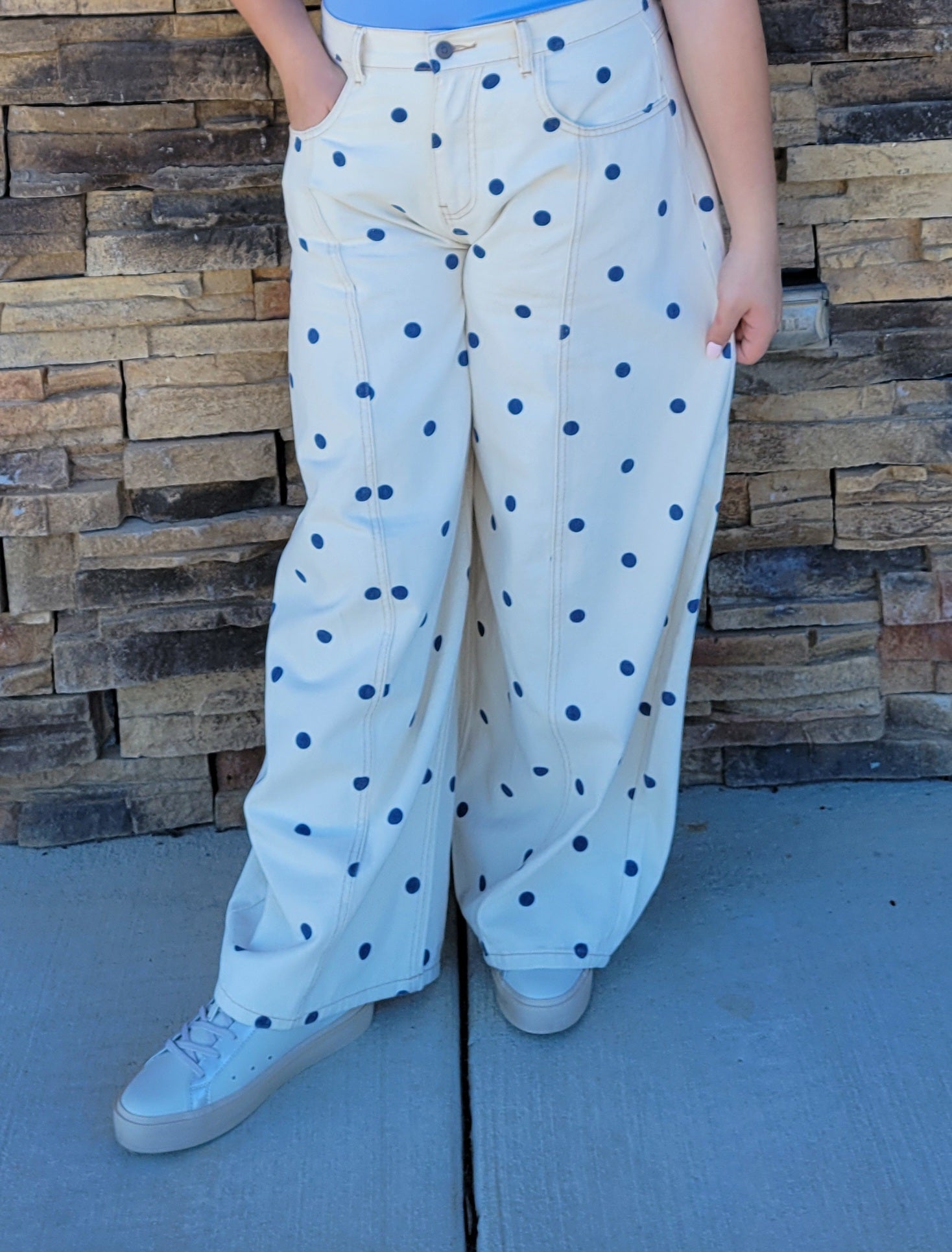 Add a splash of fun to your wardrobe with the Trixie Pants! Made from 100% cotton, these wide-leg denim pants feature a lively polka dot print that lets your playful side shine. Comfortable and breathable, they’re perfect for breezy days out or casual hangouts. Pair them with a simple tee for effortless style that never goes unnoticed.
