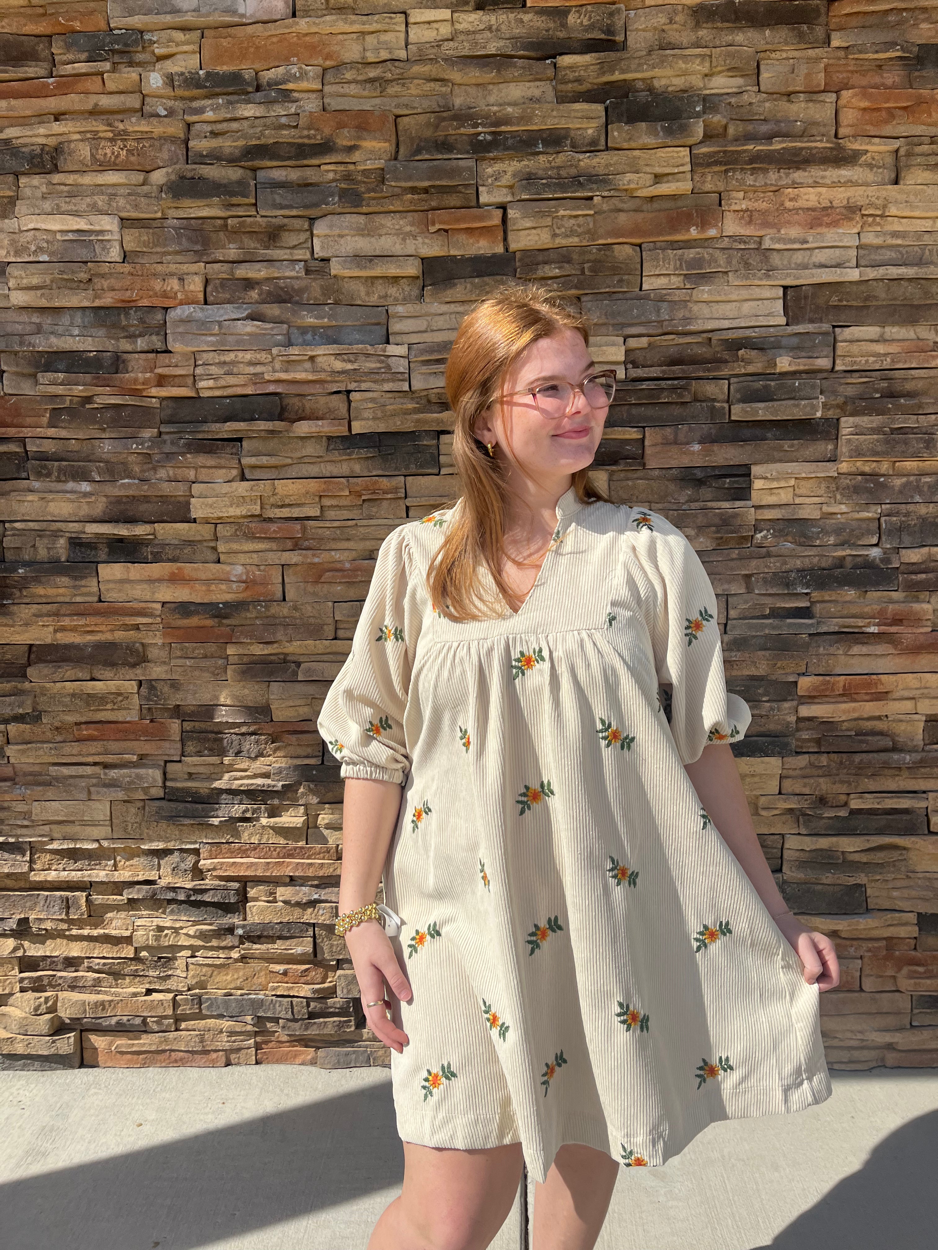 This Ingrid Dress is crafted from soft corduroy and features a delicate floral design on the long sleeves. With its comfortable fit and elegant details, this dress is perfect for any occasion. Elevate your wardrobe with this timeless piece.