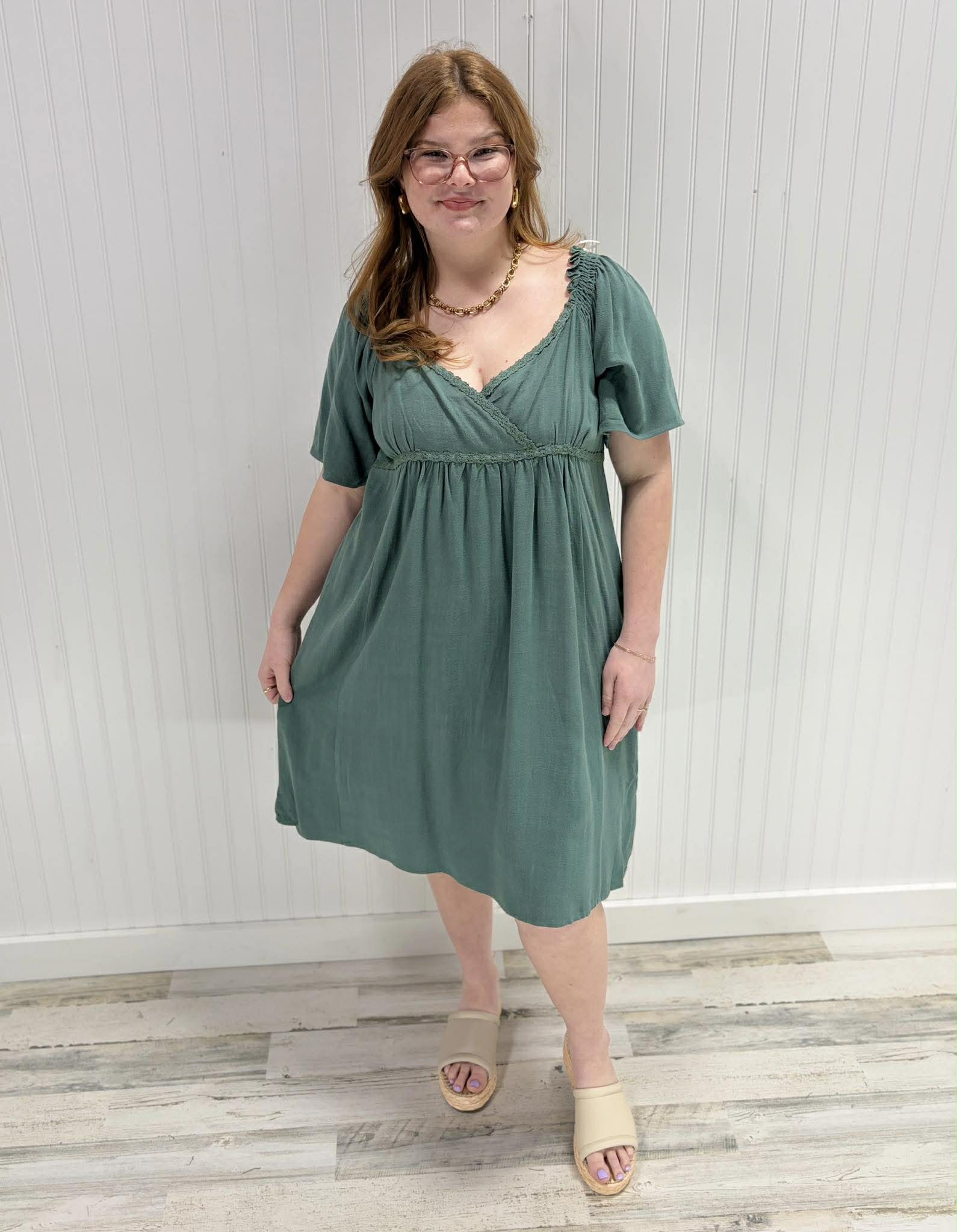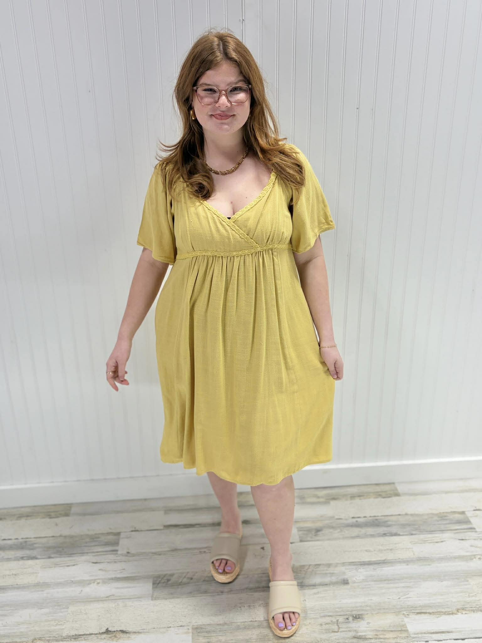 The Marilyn Dress brings effortless elegance with its linen-cotton blend that breathes beautifully in warm weather. Featuring a flattering surplice bodice and delicate crochet trim, this unlined piece offers a relaxed, sophisticated silhouette perfect for casual outings or dressed-up occasions. The 55% linen and 45% cotton fabric blend provides natural texture and comfort, while the thoughtful design details add just the right amount of charm. Easy to care for and endlessly versatile, it's your new go-to for looking polished without trying too hard.