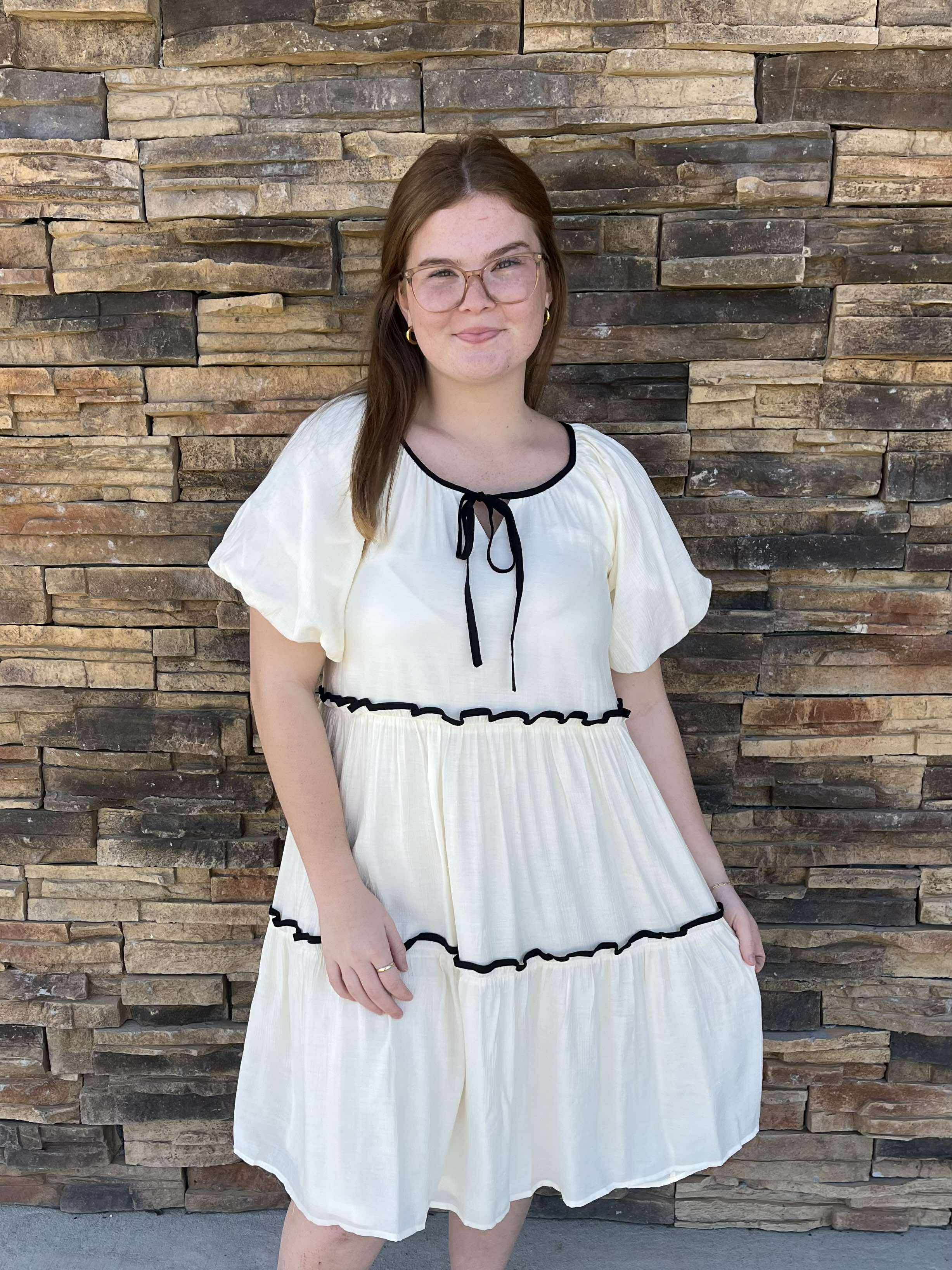 The Natalie Dress brings playful charm to your wardrobe with its short sleeves and flattering tie detail. Perfect for sunny days or casual outings, this dress adds a fun twist to effortless style. Easy to wear and ready to impress!