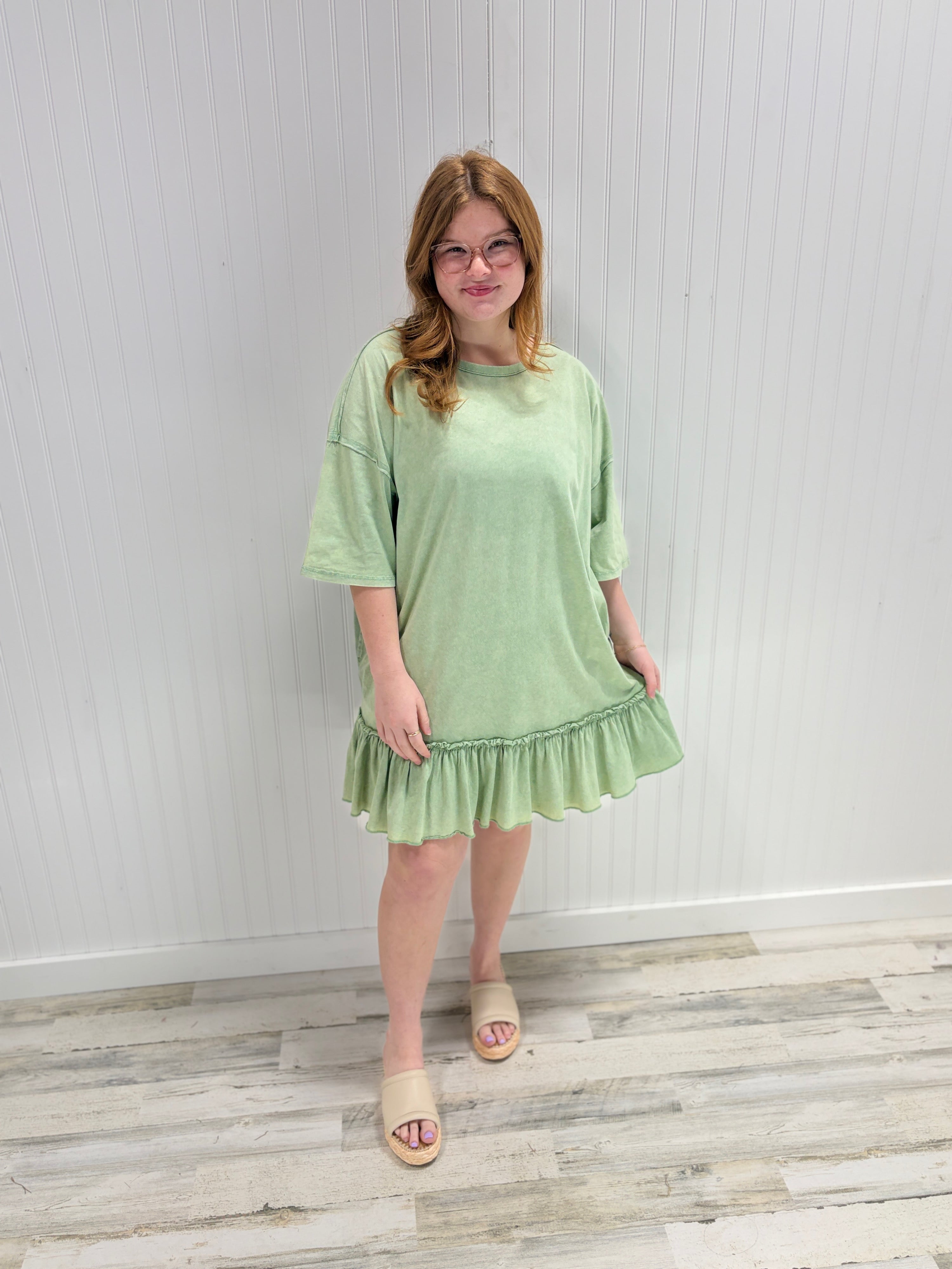 Slip into effortless style with this oversized tunic dress that's equal parts cozy and chic. Featuring a relaxed crew neckline, dropped shoulders, and half-length sleeves, it's designed for maximum comfort. The mineral-washed cotton gives it that perfectly lived-in look, while playful ruffles at the hem add a flirty finishing touch. Perfect for casual days when you want to look put-together without trying too hard.