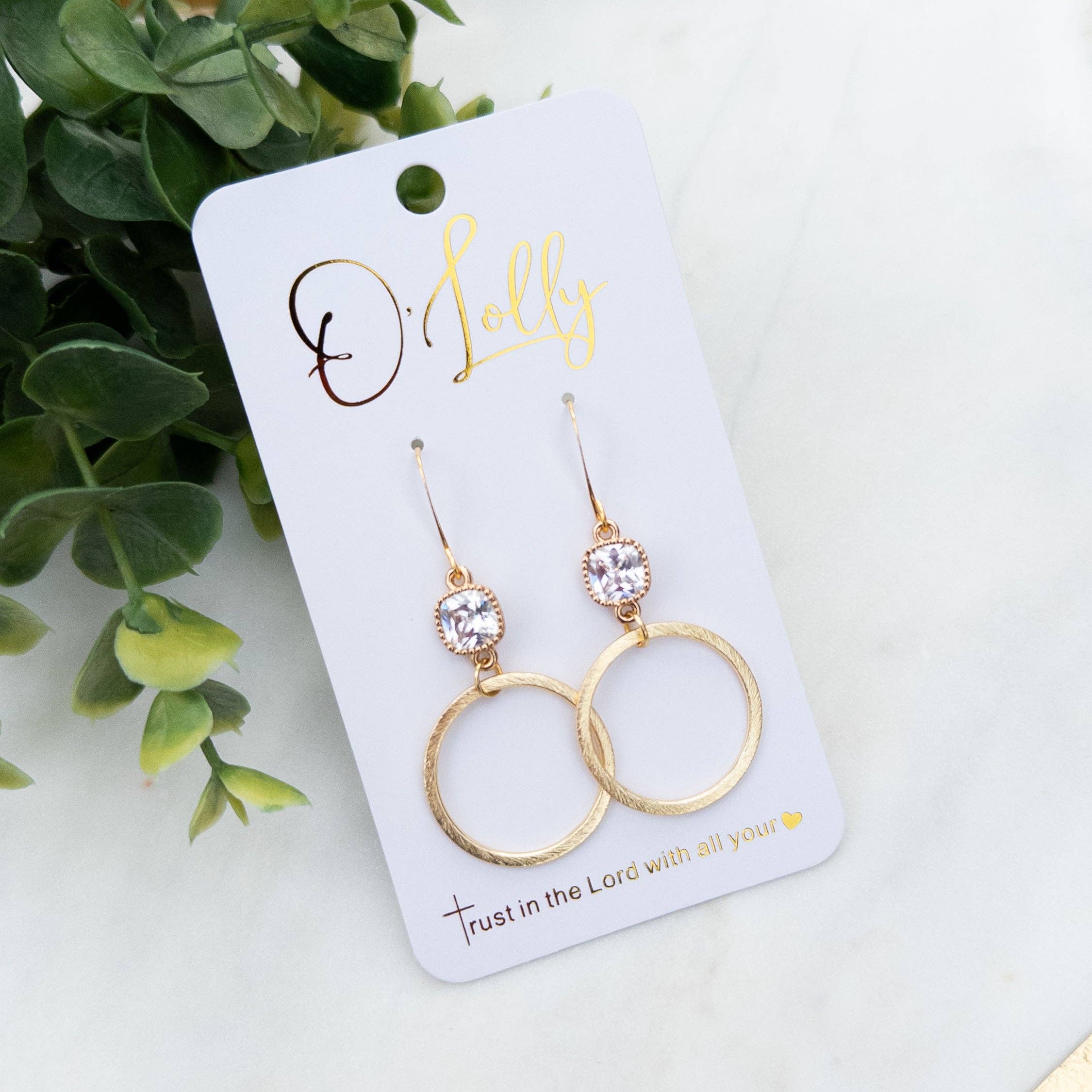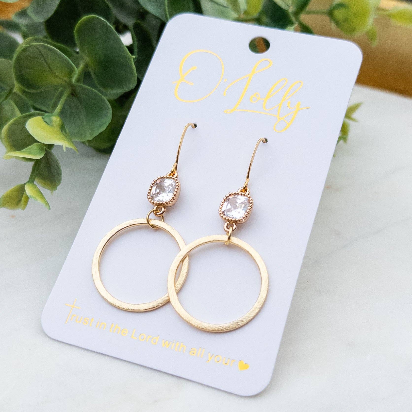 Featuring a gorgeous combination of sparkling cubic zirconia stones and a gold textured hoop, "Ollie" dangle earrings measure approximately two inches in length.