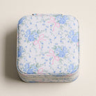 Cute and compact jewelry box with a blue floral and pink bow design. Made from durable PVC, it's perfect for keeping your pieces organized at home or on the go. Measures 3.75" x 3.75" x 2" and super easy to clean.