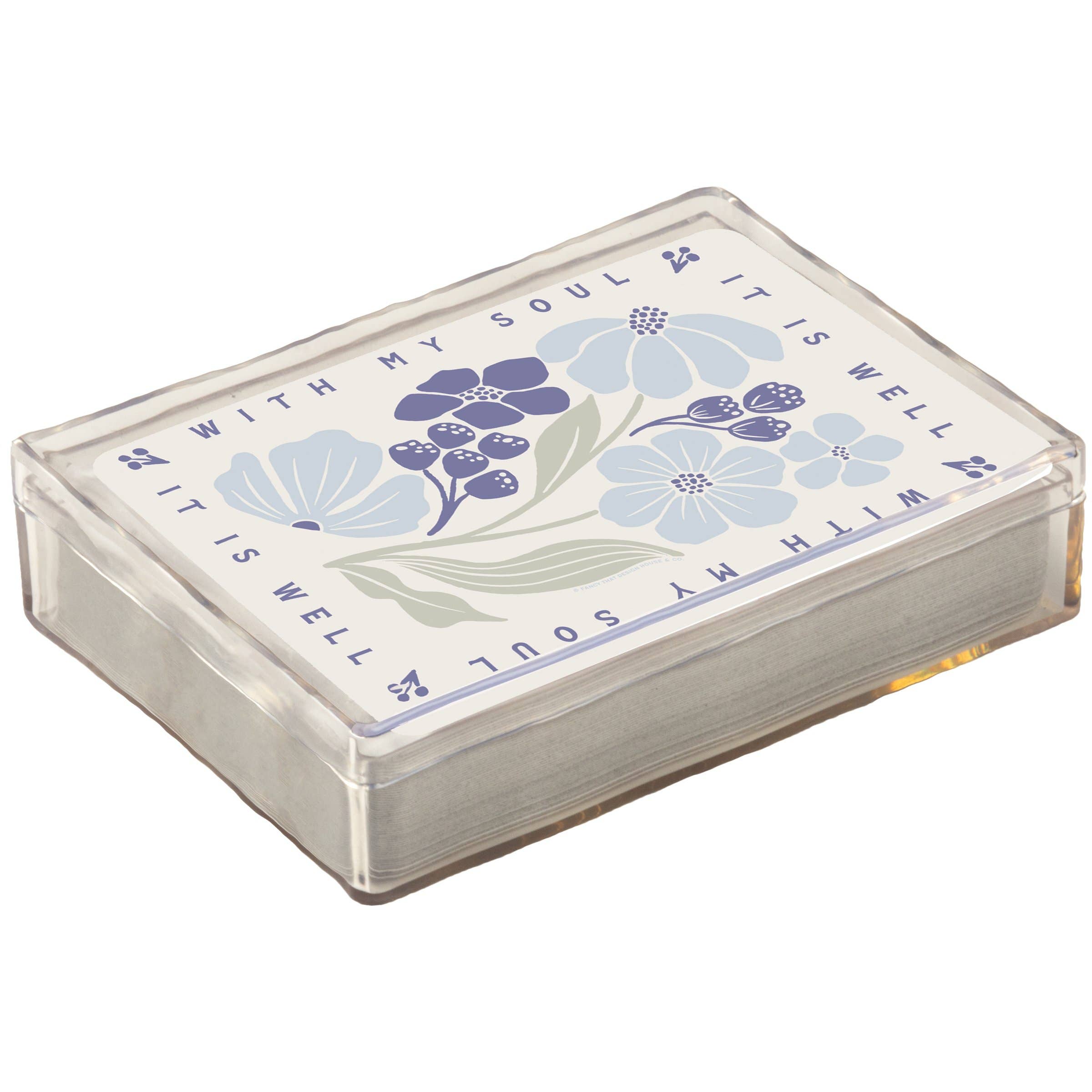 A 54-card playing deck from our Faith Collection displaying beautiful botanical designs on each card with an inspirational sentiment on the back that reads "It Is Well With My Soul." Botanical designs are replicated from original hand illustrated artwork. Our It Is Well playing cards are packaged in a protective acrylic case for easy storage when not in use or traveling. An inspirational accessory perfect for gifting and on the go games.
