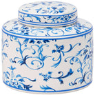 A small ceramic jar from our Indigo Collection displaying a chinoiserie inspired pattern of ornate blue florals on the jar and coordinating lid. Decorative jar features design resembling a vintage tea jar. Floral jar is ideal as a vessel for flowers or for stylish storage of small household items. Hand wash only. Our small IndigoTea jar is a stylish floral-themed home accent perfect for everyday display.