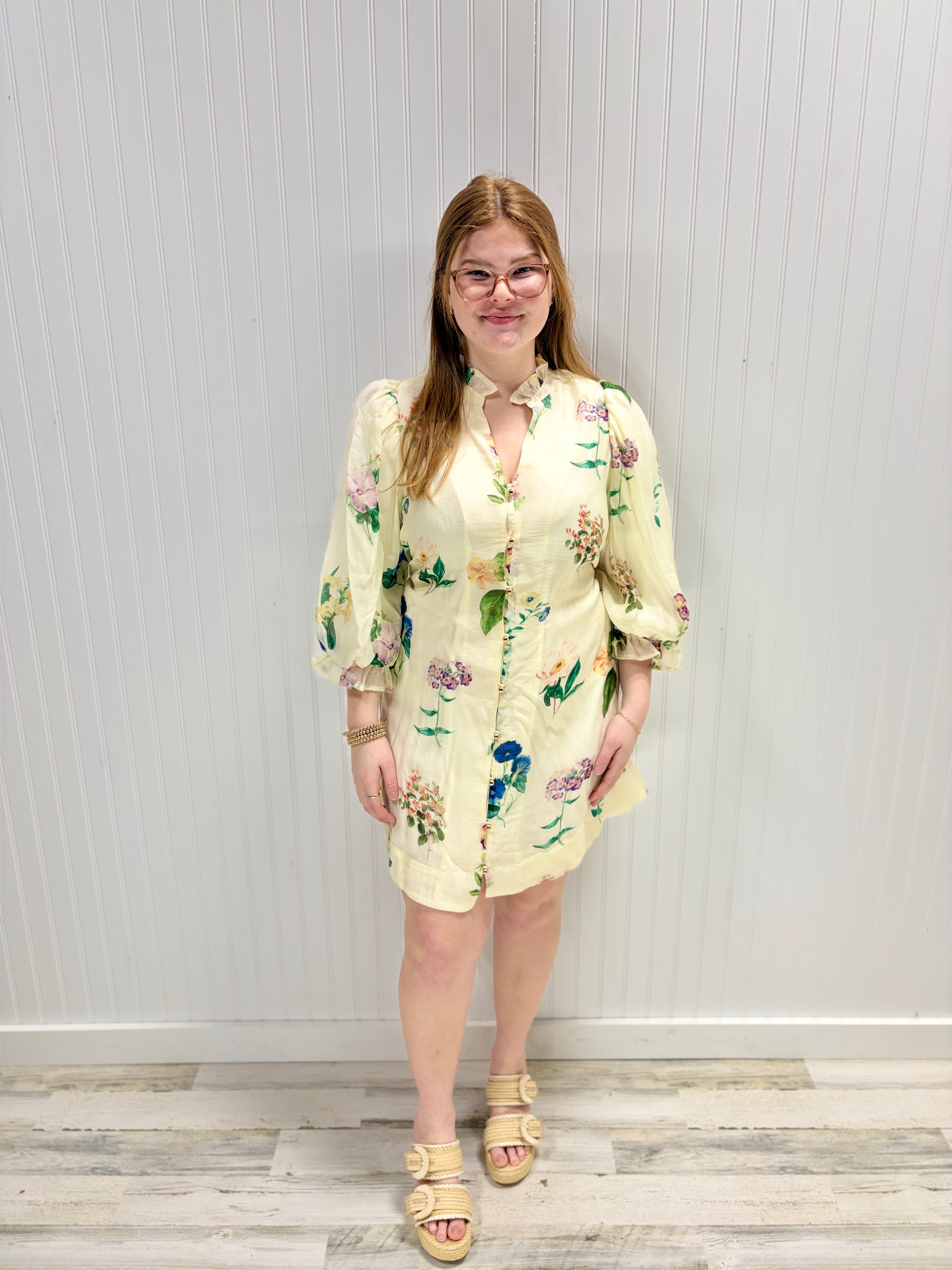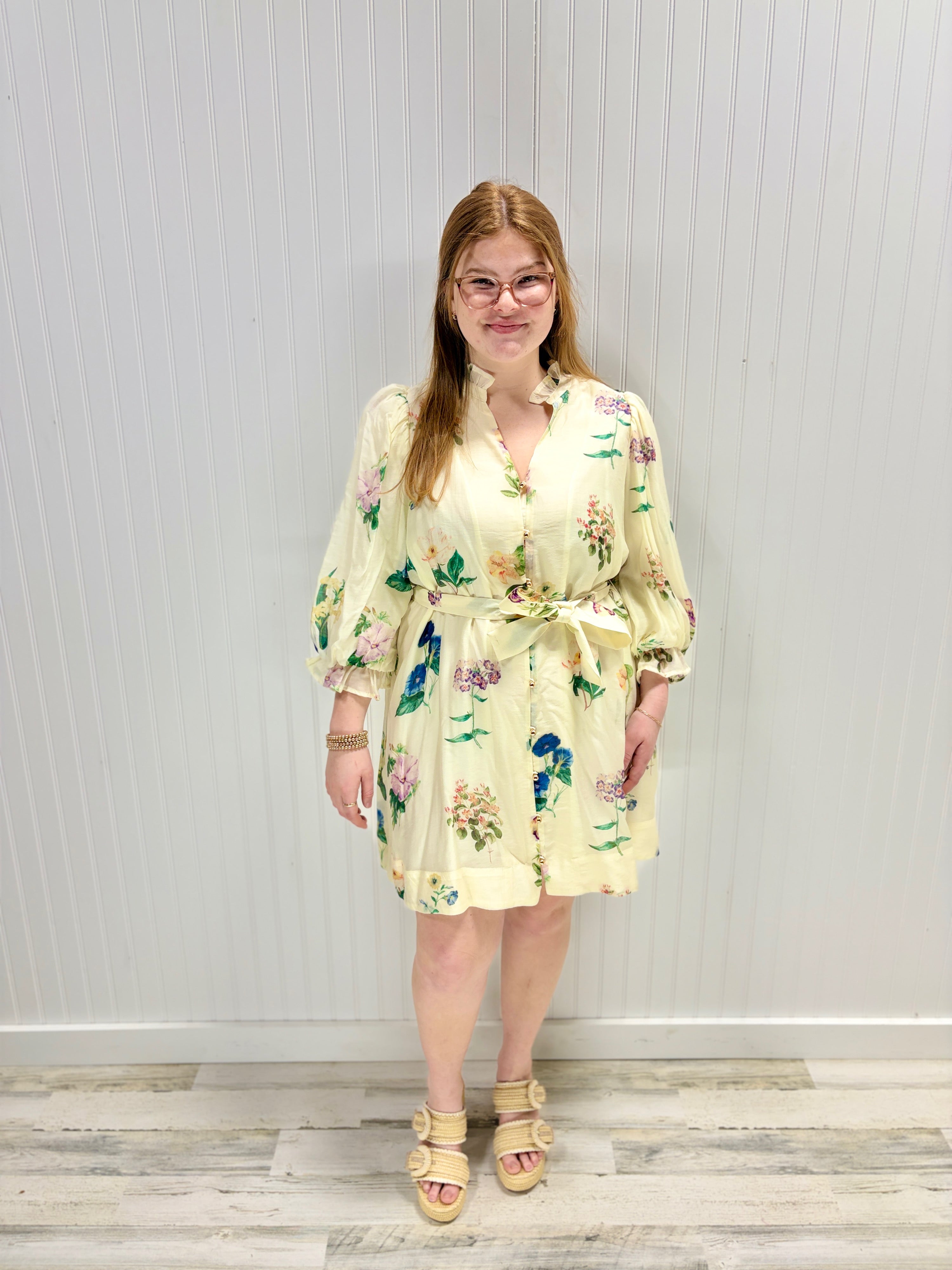 Floral mini dress that's all fun and femininity. Puff sleeves, ruffled neckline, and a tie sash create instant charm. Buttoned front, elasticated cuffs, and fully lined for easy wear.