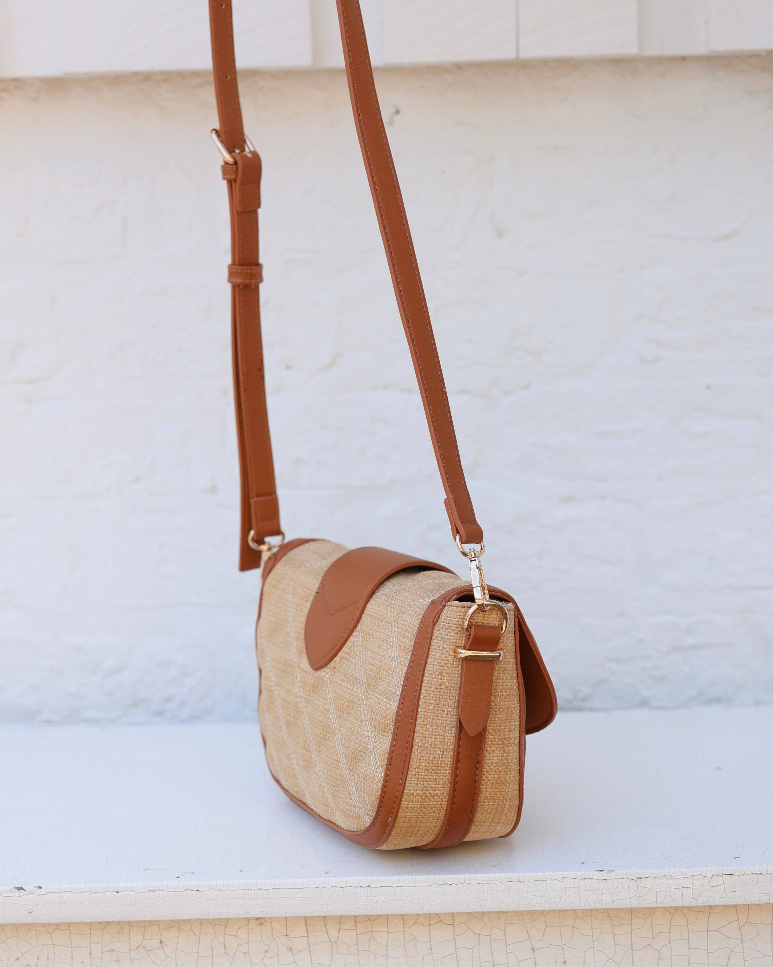 Elevate your style with the Griffin Crossbody Bag in Natural Straw with Saddle. Crafted from straw material with timeless diamond quilting and black faux lambskin, it showcases the signature shiny gold Caroline Hill logo on a magnetic flap. Inside, stay organized with a zippered pocket and two open compartments, while its structured design keeps the bag looking polished all day. Adjustable Strap for ultimate comfort.