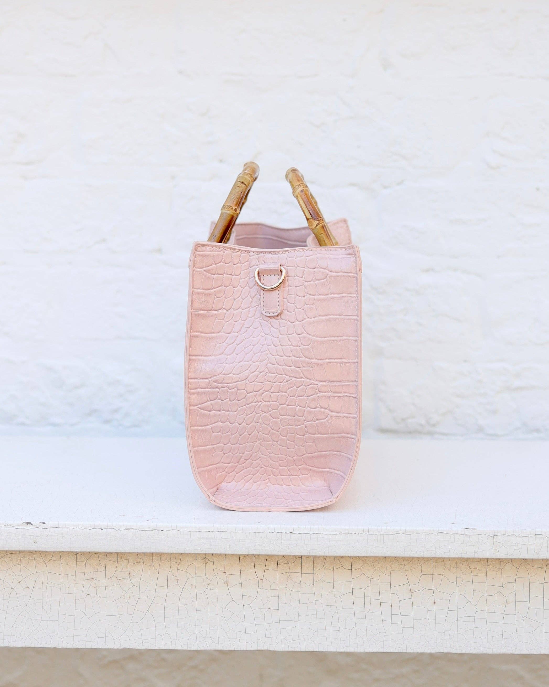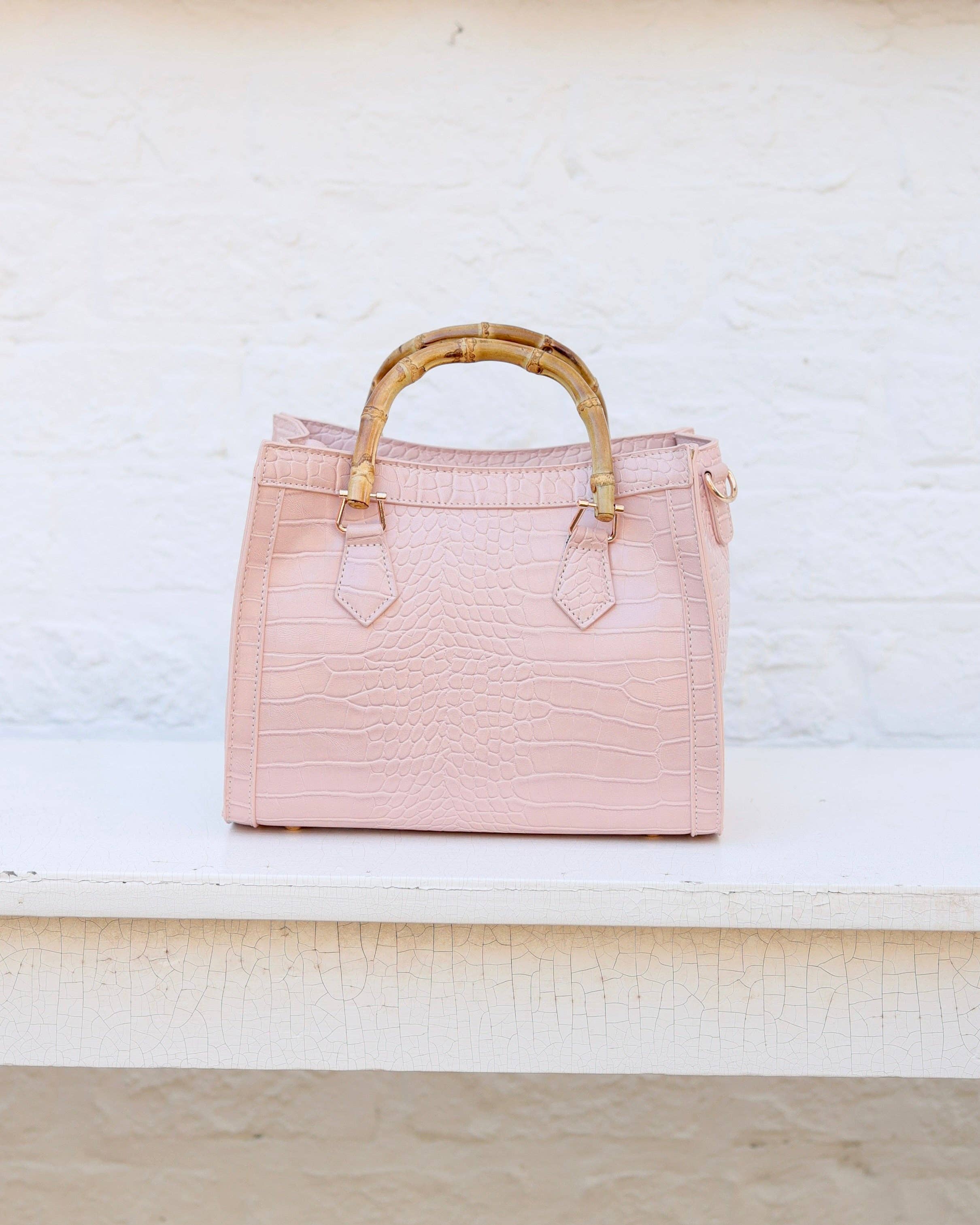 The Kennedy Tote in Blush Vegan Croc is this season's must-have style. Crafted with elegant bamboo handles and a removable crossbody strap, this mini tote transitions effortlessly from day to evening. Whether you're carrying essentials to the office or out for the weekend, its chic silhouette and versatile design make it the perfect companion for any occasion.