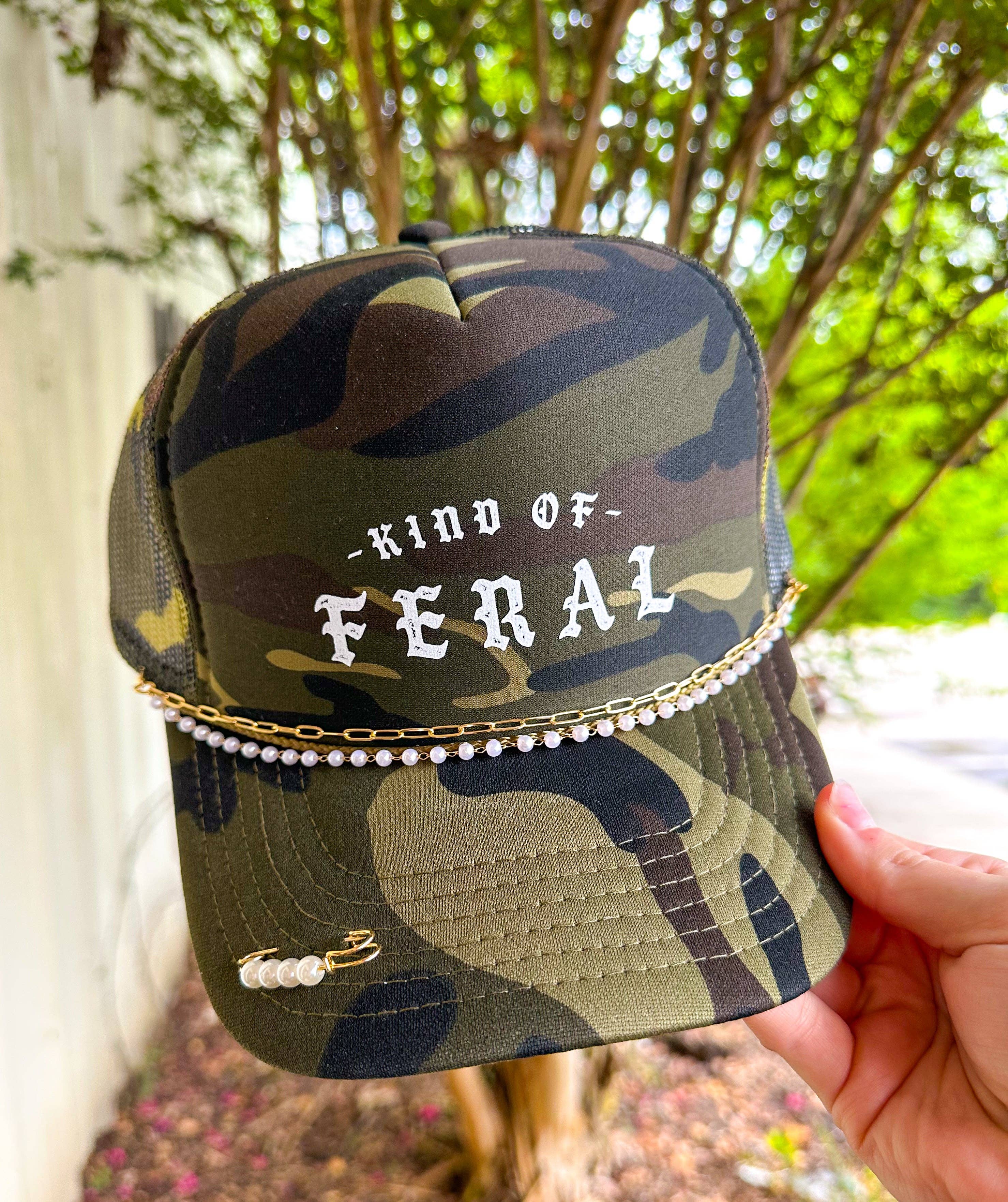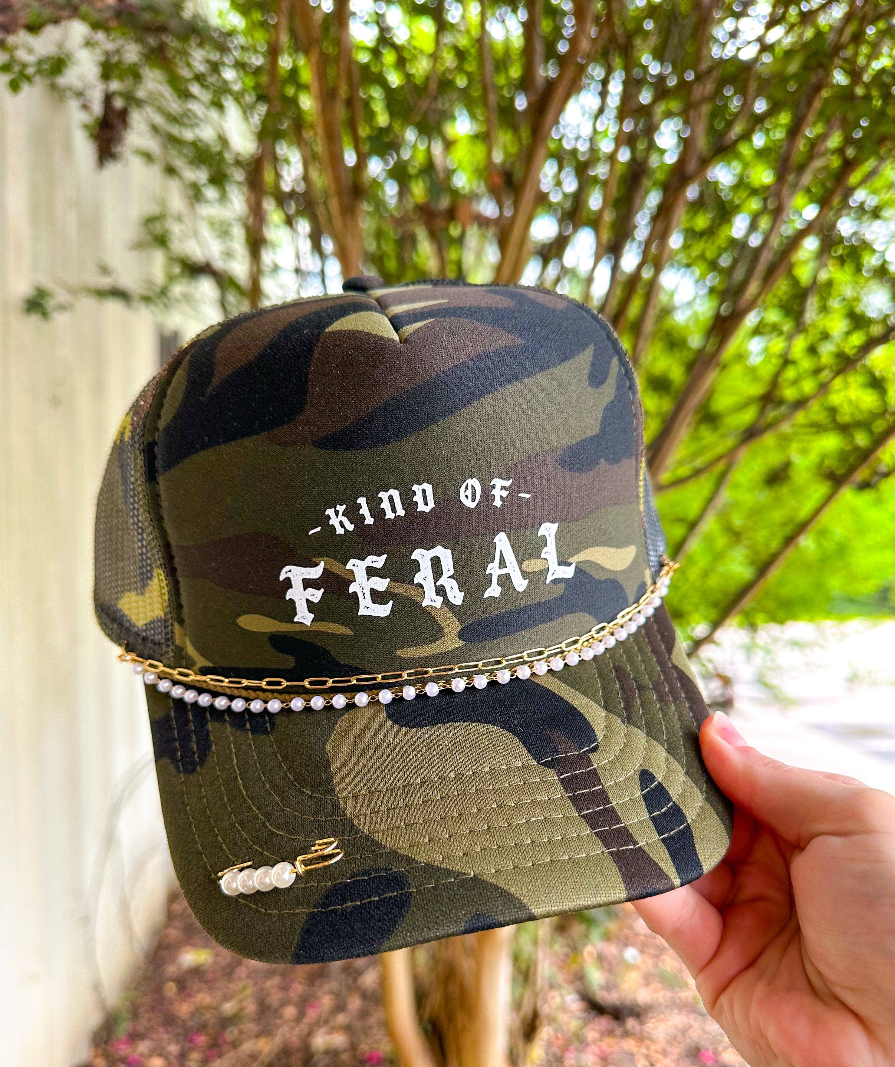 Full Camo Trucker Hat - Kind of Feral Somewhere between unbothered and unhinged. This camo foam trucker hat brings chaotic energy in the best way possible. With a structured foam front, breathable mesh back, and adjustable snap closure, it’s made for the ones who thrive in a little mess. Comes with a gold hat chain (design may vary)—because being feral doesn’t mean being unfashionable.