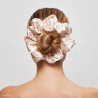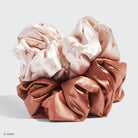 -Two luxe, limited-edition satin scrunchies in bronze & a creamy crown print keep your hair silky & protected during beauty sleep & beyond