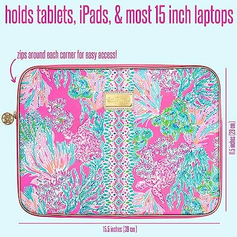 Keep your tech devices safe and sound in this stylish laptop case by Lilly Pulitzer. 15 inch laptop case features a soft interior lining that allows computers to easily glide in/out and a thick neoprene exterior with a metal zipper for added security and protection as you travel. Plus, it comes with a handy zip pouch to store your charging cords, earbuds, and other must-have accessories.