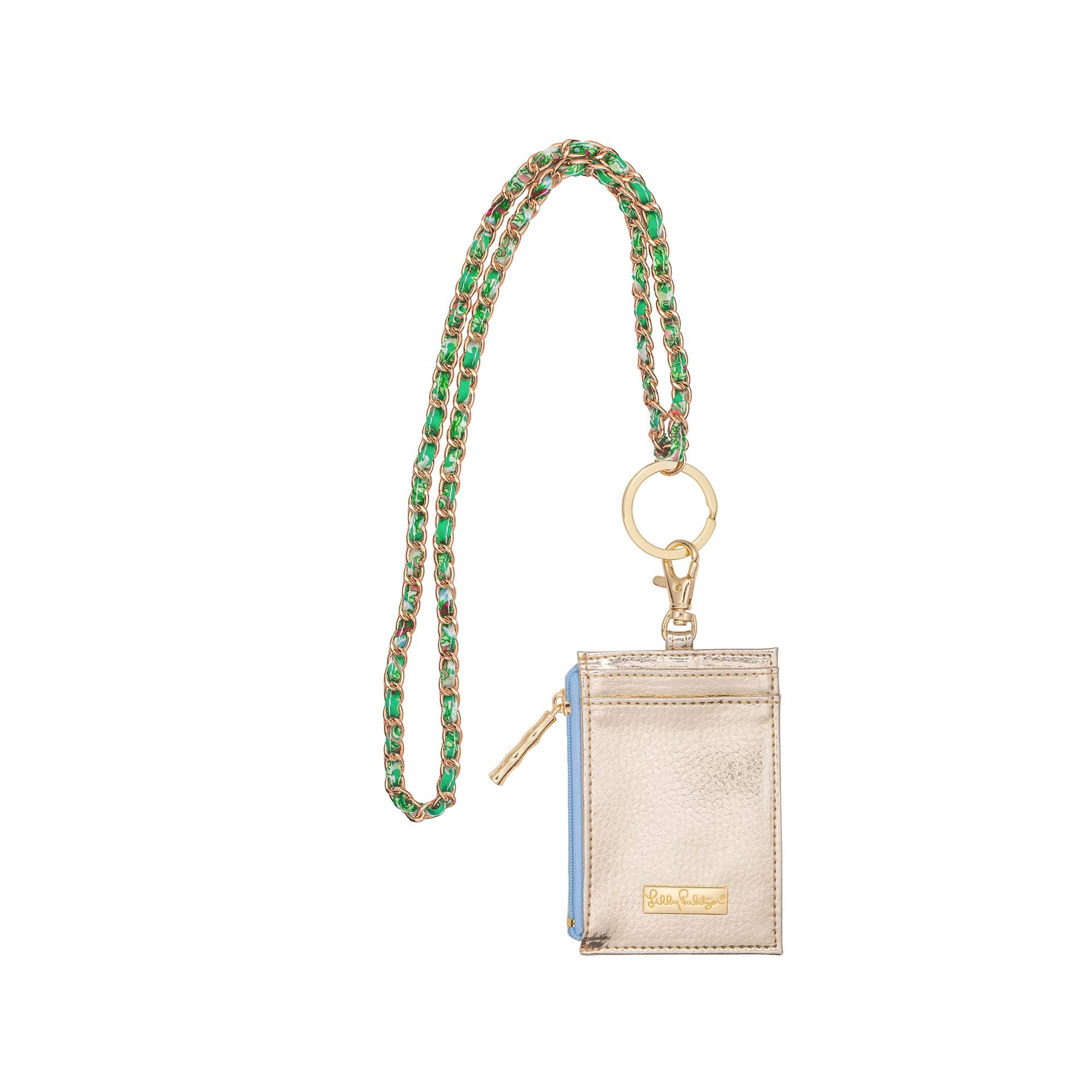 Effortlessly chic and made for life on the go, the Lilly Pulitzer Zip ID Lanyard Wallet delivers the perfect blend of style and function. Crafted from shiny gold leatherette, this compact card holder keeps your essentials close—without compromising on elegance. The design features two card slots, a clear plastic ID window, and a secure zip closure for cash or keys. A patterned lanyard strap adds that signature Lilly flair, while gold hardware enhances its polished, resort-ready finish. Ideal for travel, errands, or daily commutes, this lightweight wallet makes organization look effortlessly glamorous. Key Features: Luxe shiny gold leatherette exterior 2 card slots and a clear ID window for easy access Zippered closure for coins or small essentials Gold hardware accents for a chic finish Printed lanyard strap featuring a vibrant Lilly pattern Compact and lightweight for hands-free convenience.