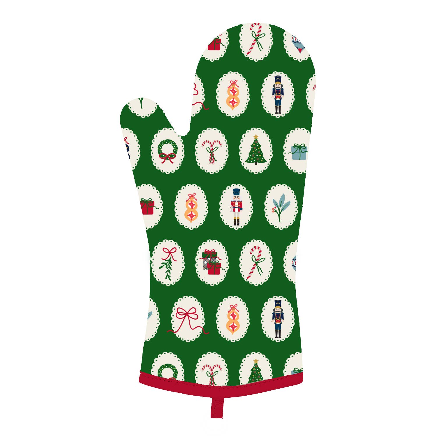 Add a touch of festive elegance to your kitchen with our Christmas Tiddings Oven Mitt. Featuring a deep, rich green color accented with classic holiday icons, this mitt brings seasonal charm to your cooking and baking. Quilted for comfort and designed for easy use, it’s a stylish essential for every holiday kitchen.