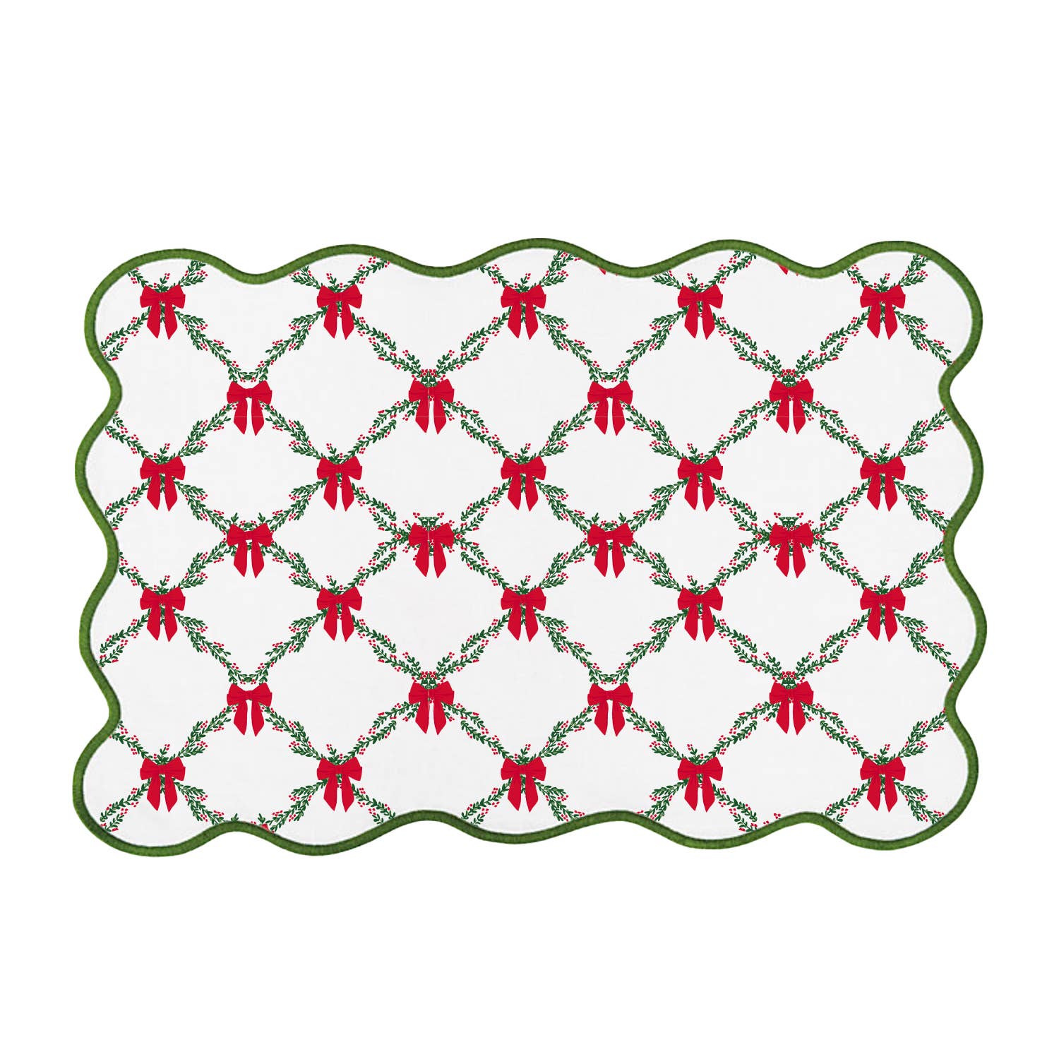 Set a festive table with our Reversible Holiday Trellis Scallop Edge Placemats. Featuring our classic holiday trellis design on one side and a coordinating solid on the other, these placemats offer versatile style for any seasonal occasion. Finished with a charming scalloped edge, they add a touch of elegance and holiday cheer to your dining experience.