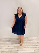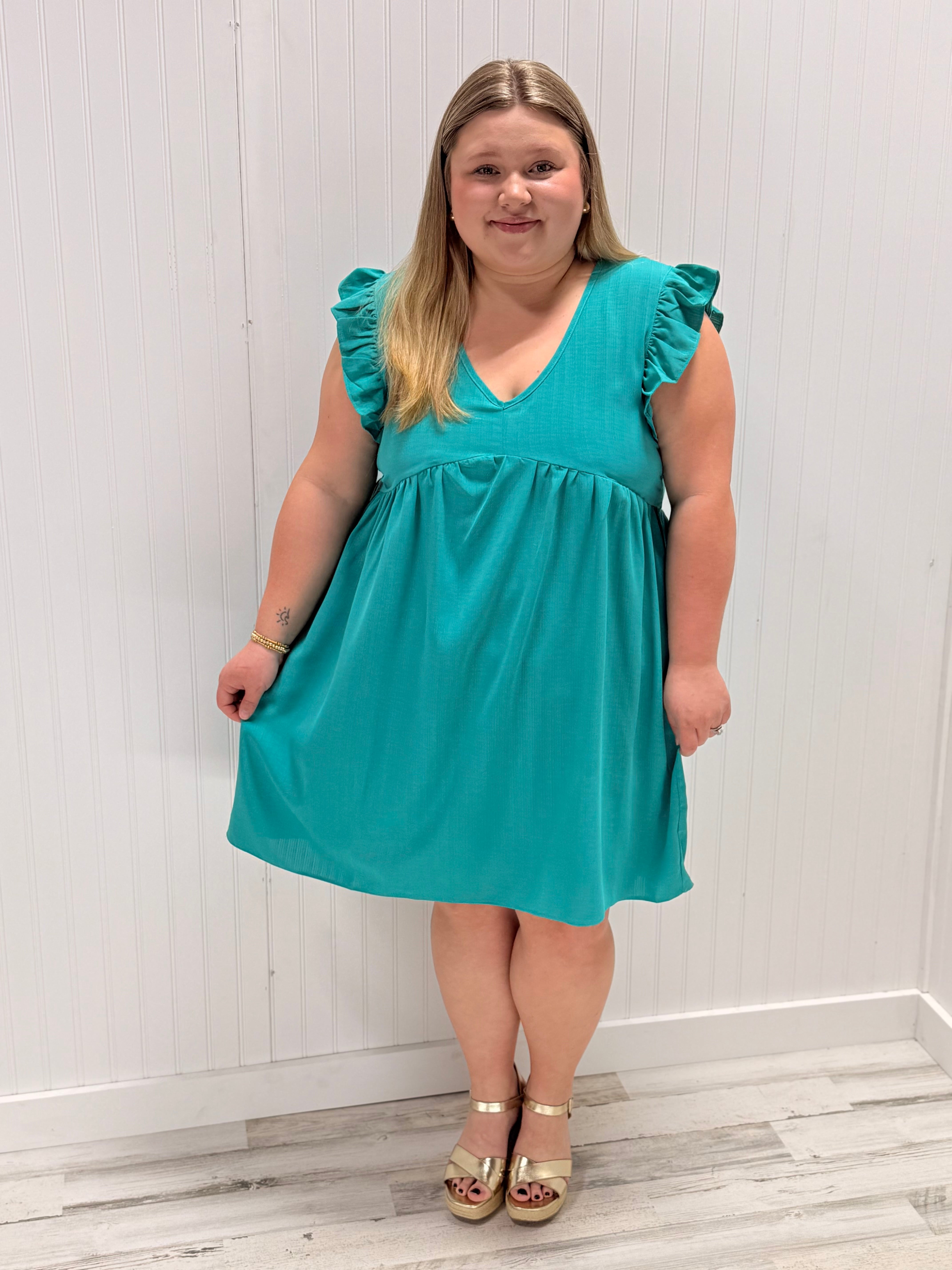 Curvy Storie Dress in 100% polyester with a flattering V-neck, fun ruffle sleeves, and practical pockets. No lining needed!