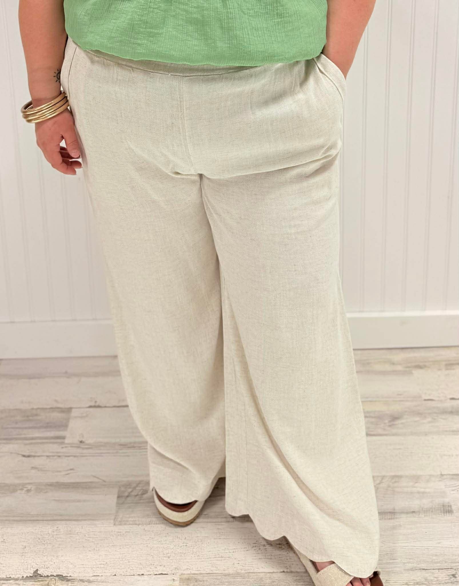 Strut in style with these breezy Curvy Tyler Pants, where comfort meets personality. Crafted from a breathable linen-cotton blend, these wide-leg beauties feature an elastic waistband for easy movement and functional side pockets for your essentials. The signature scalloped hem adds a flirty, feminine touch that sets them apart. Unlined for maximum breathability, they're your go-to for effortless, feel-good dressing all season long.