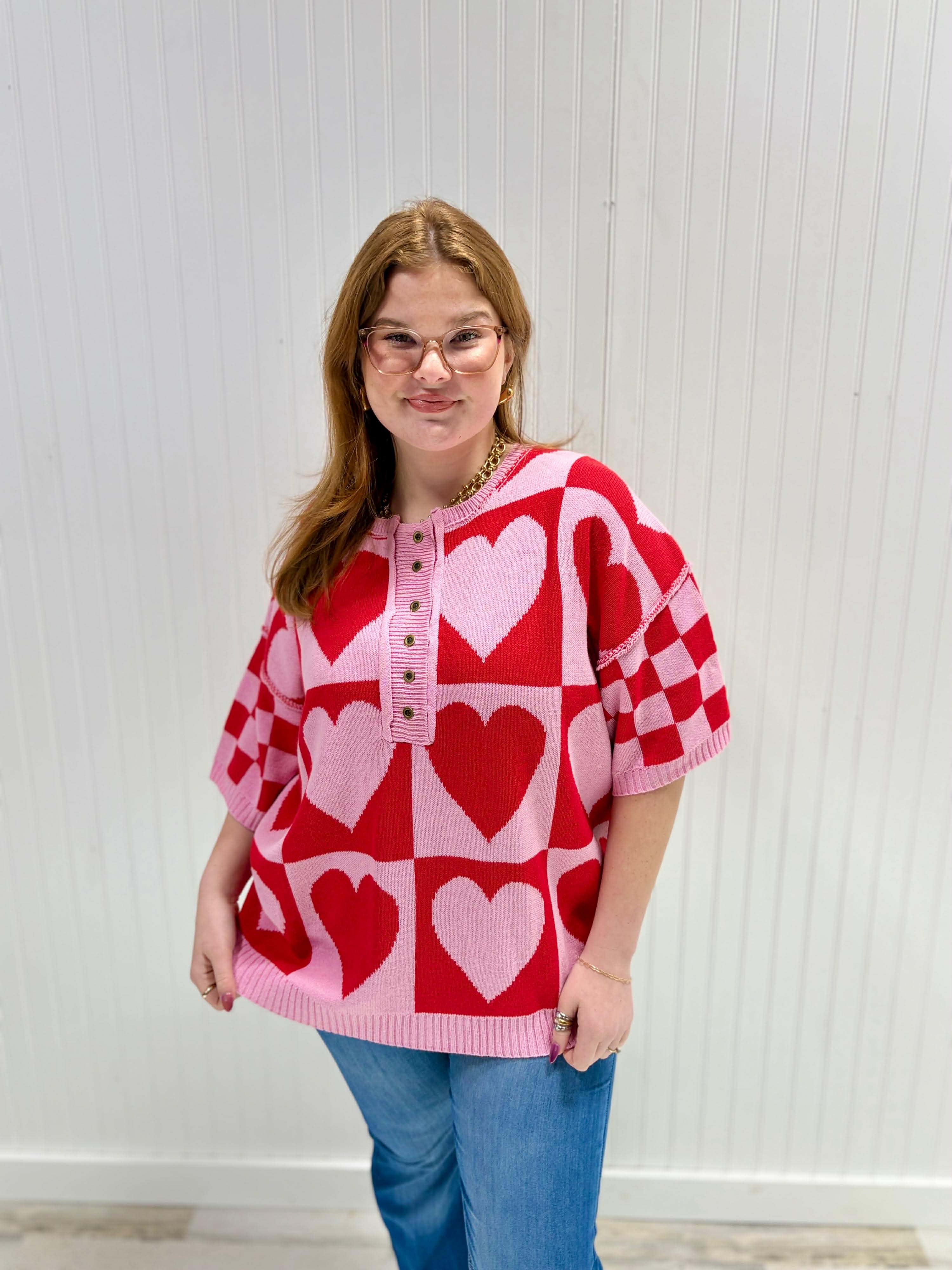 Spread the love in our Melody Top, a charming color-block heart sweater that's equal parts cozy and cute. Featuring bold, contrasting panels that frame a playful heart design, this piece brings instant personality to your everyday rotation. Perfect for layering or wearing solo, it's the kind of sweater that makes you smile every time you pull it on. Soft, comfortable, and undeniably fun—your new favorite is here.