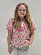 Cute botanical print top with puff sleeves, contrast V-neck, and scalloped trim. Elastic cuffs keep things comfy, and the lightweight woven fabric won't weigh you down.