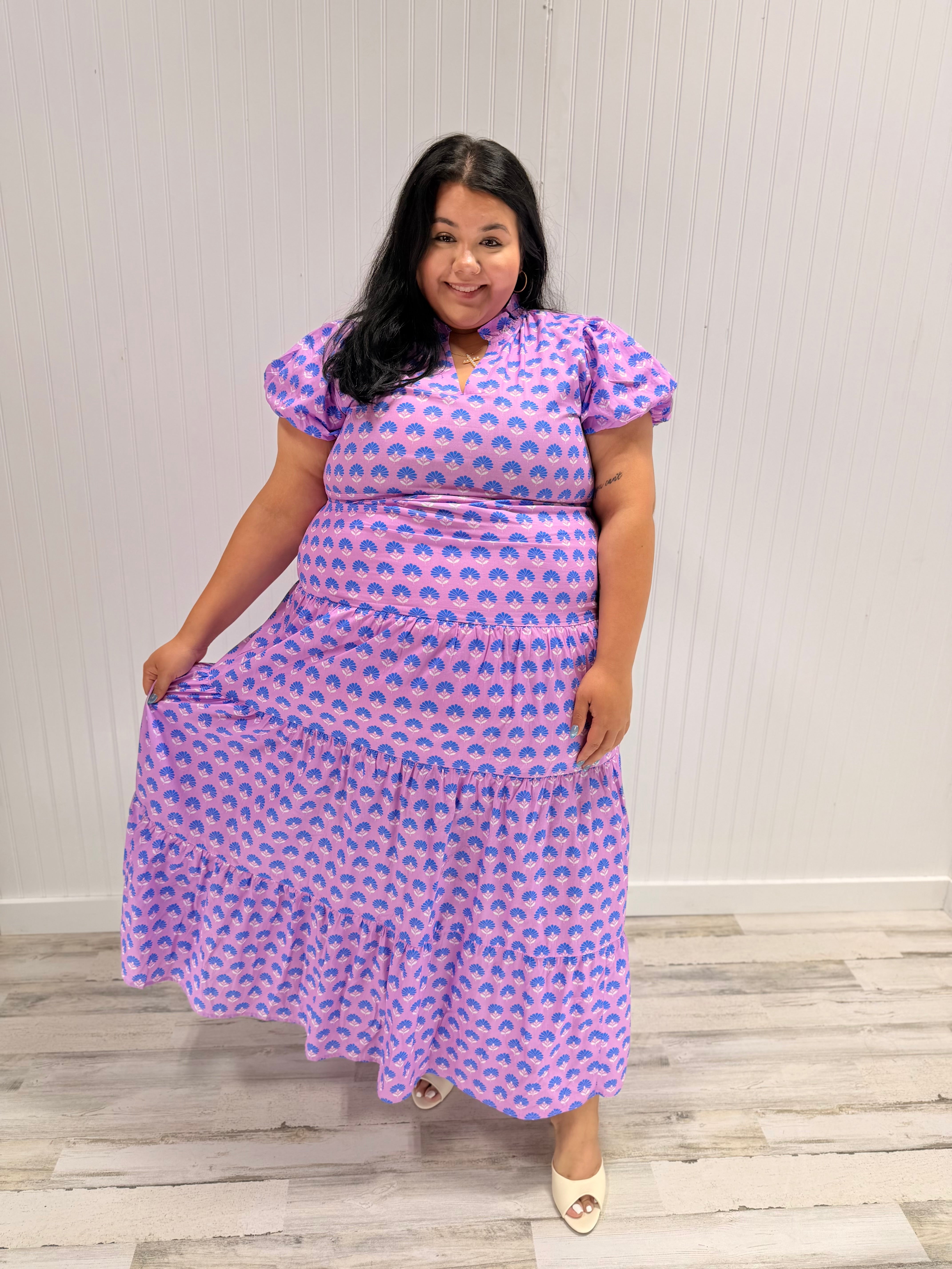 The Paige Dress combines romantic style with everyday wearability. This lightweight maxi features a vibrant floral print, delicate puff sleeves, and a flattering V-neckline. The smocked waistband provides gentle shaping while the tiered skirt creates beautiful movement. Crafted from breathable woven fabric and fully lined for opacity and comfort, it's an ideal choice for warm-weather occasions and casual elegance.
