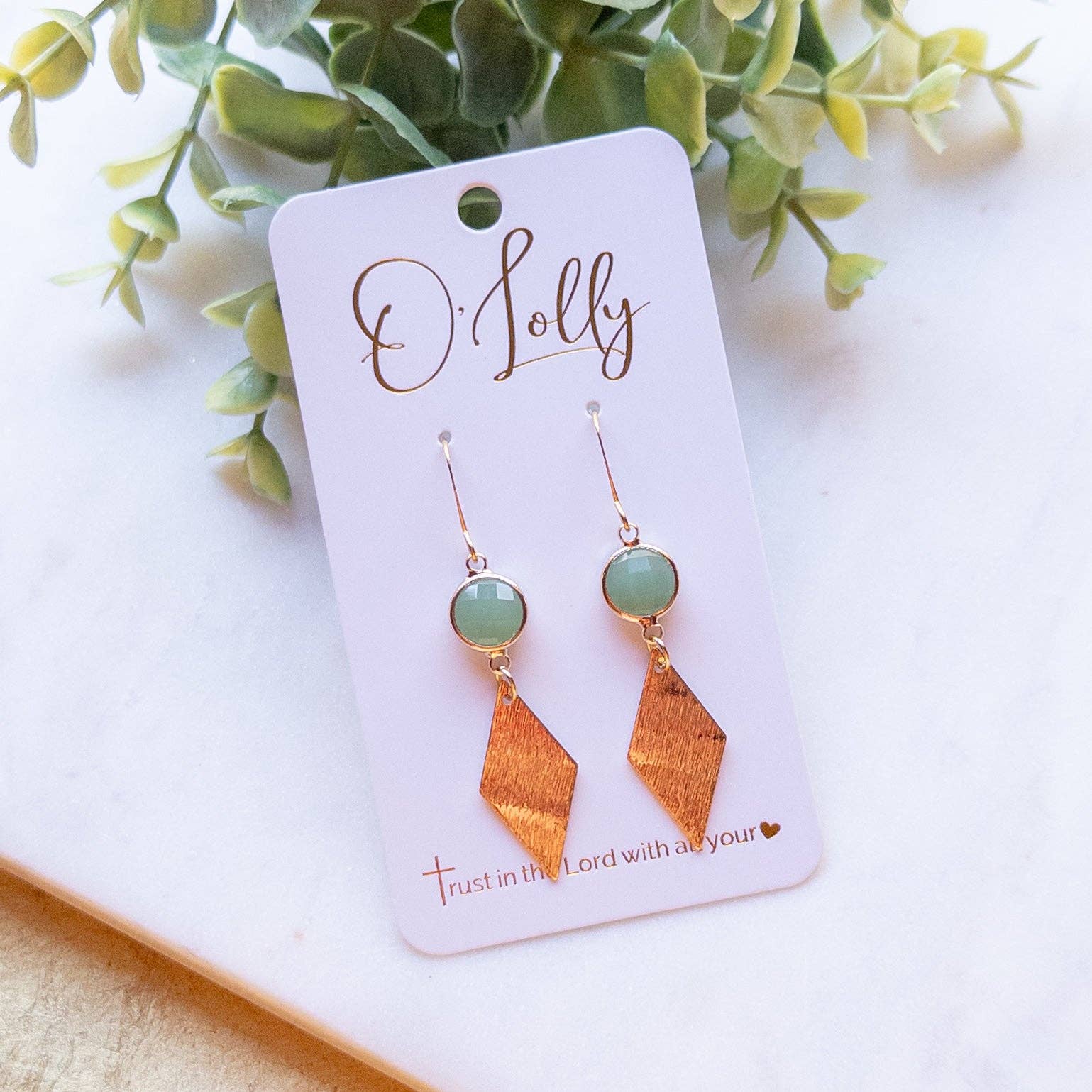 Boost your earring collection with our "Sage" green glass earrings. Featuring a rhombus dangle in 18k gold plating, these earrings exude elegance and sophistication. At 2.5 inches in length, they strike the perfect balance between boldness and versatility, making them a must-have.