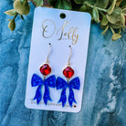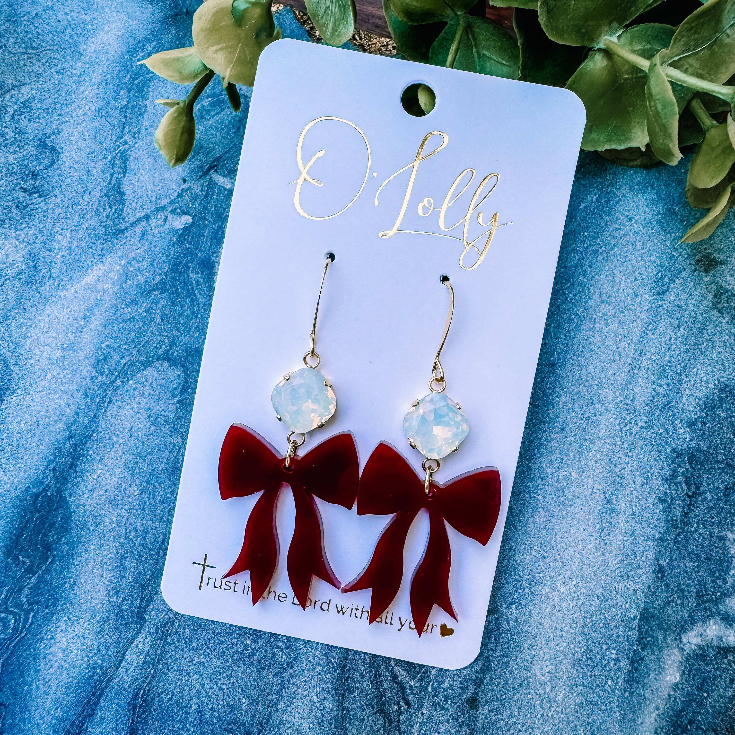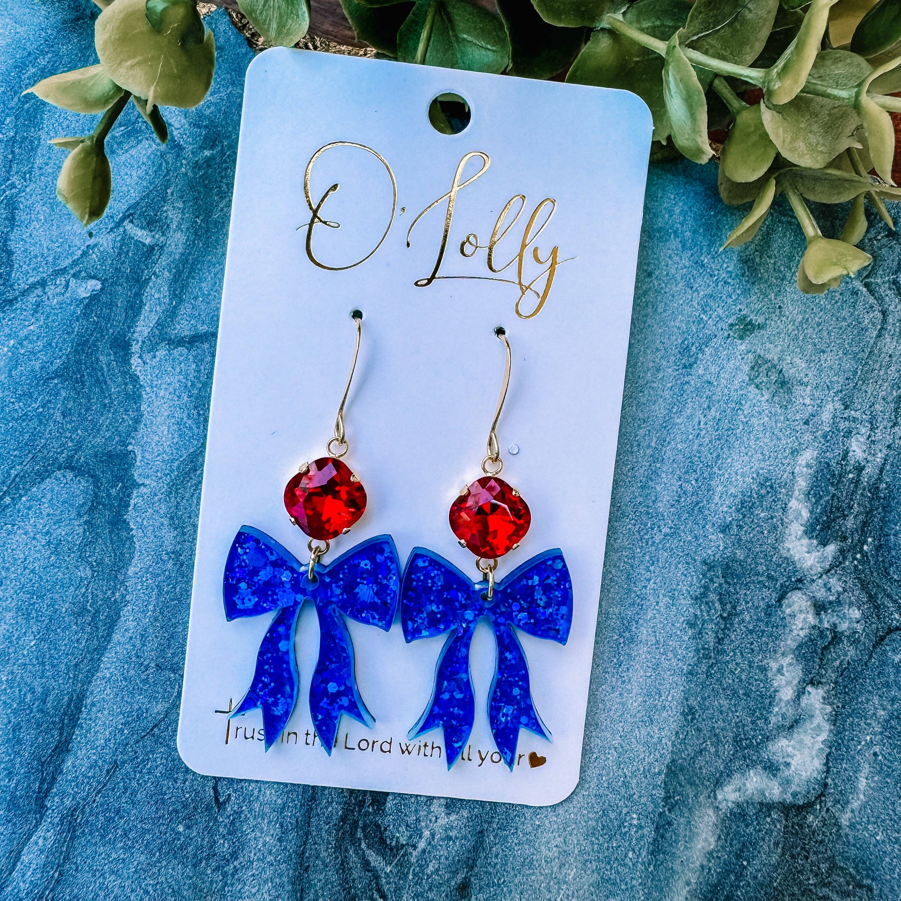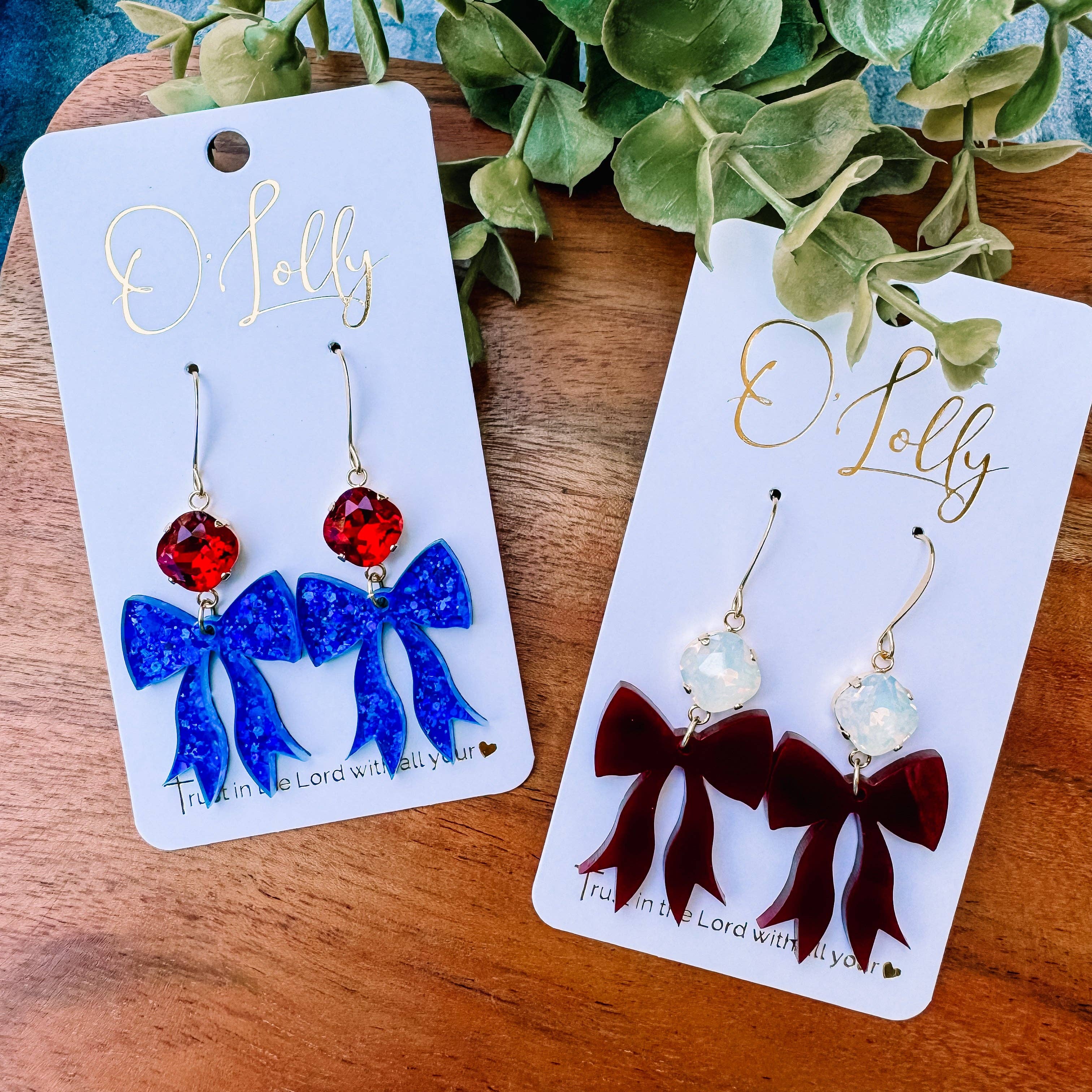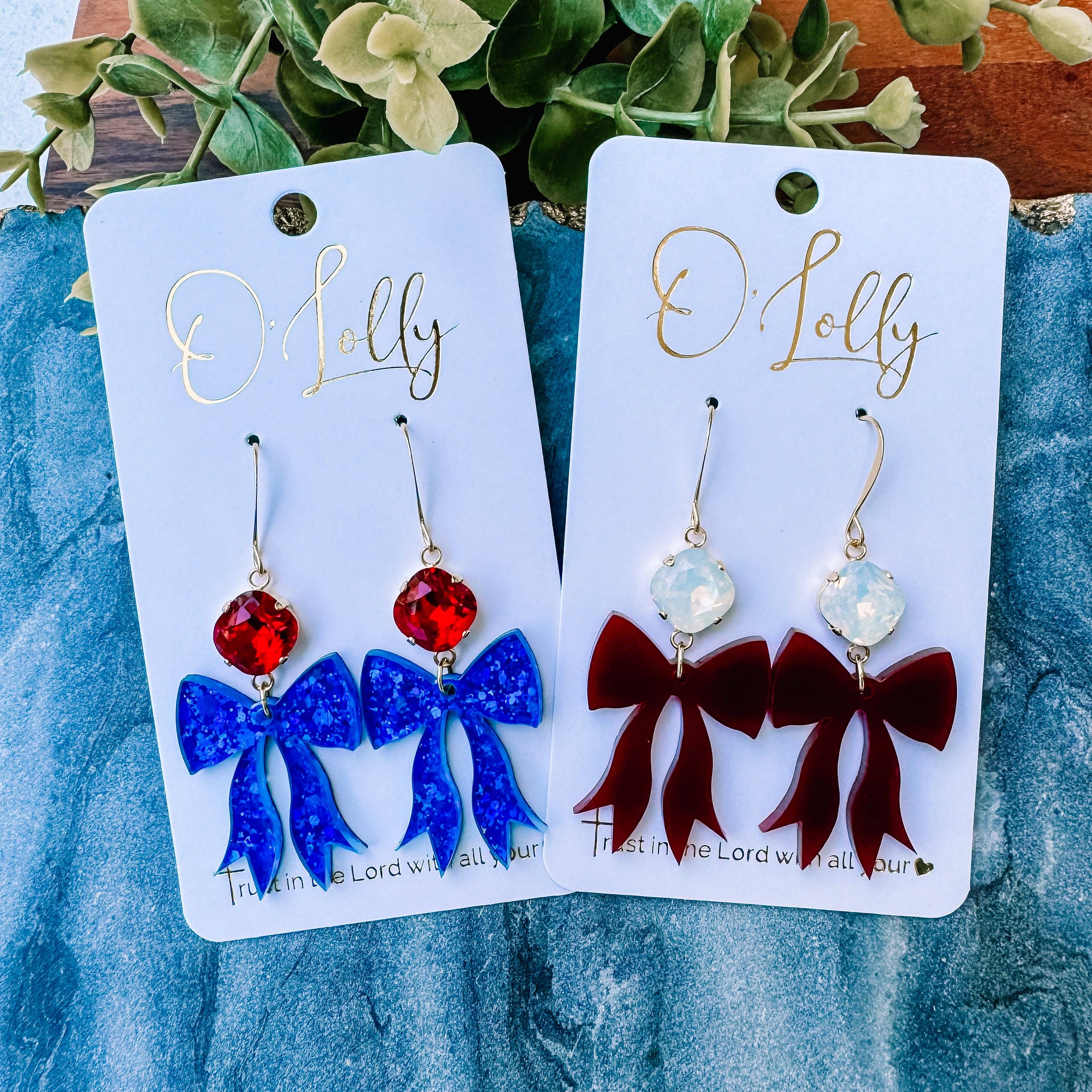 Perfectttt for MISSISSIPPI GAME DAYS!! These Stone + Bow earrings are available in Opal & Maroon and Red & Blue Approximately 2.5” long.