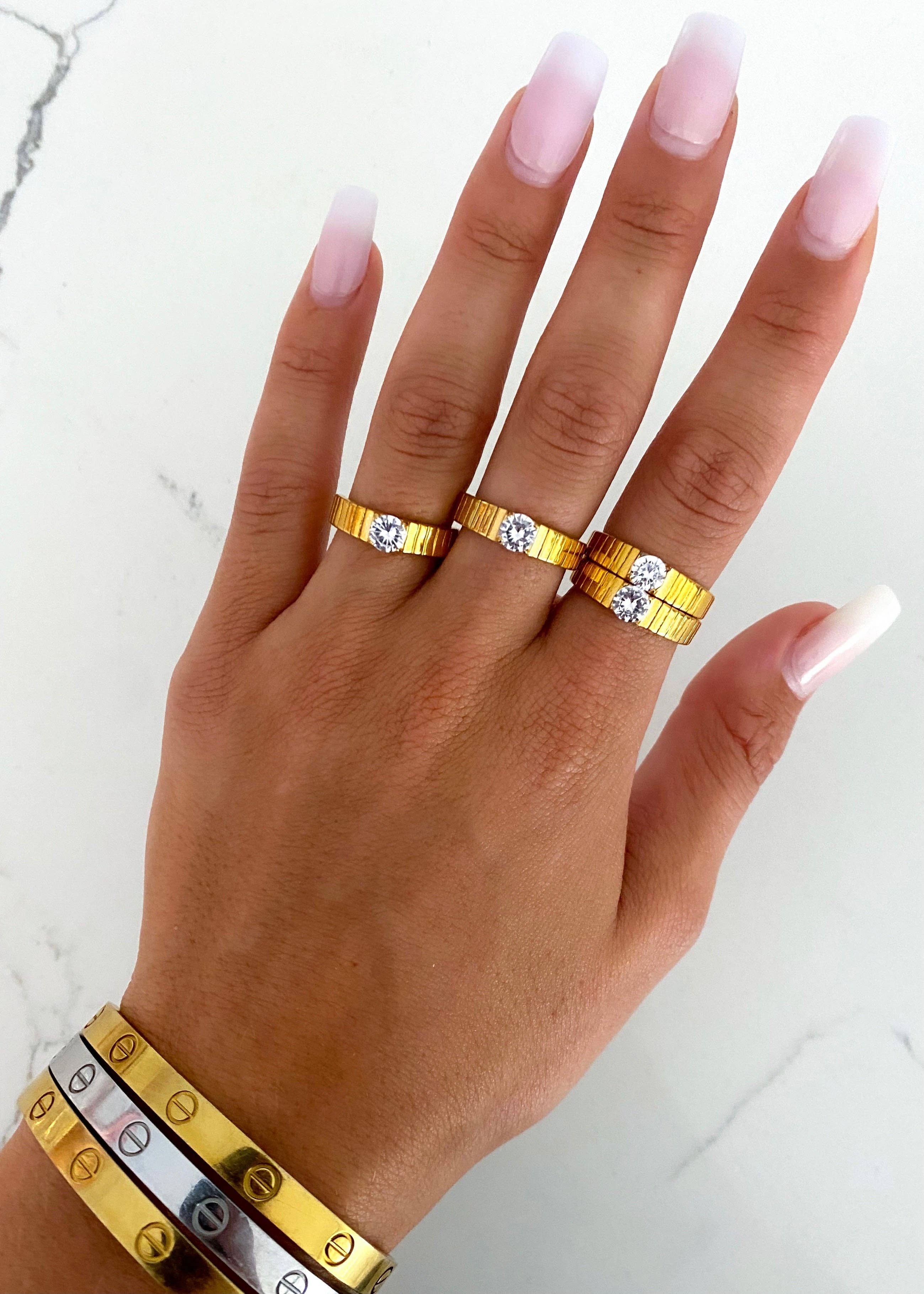 Introducing the Dainty Diamond Ring from Chansuttpearls, an elegant addition to any jewelry collection. This band/stacked ring is a timeless classic, designed with a subtle sparkle that catches the eye. Its water-resistant feature ensures durability and longevity, allowing you to wear it on any occasion without worry. Whether you're dressing up for a special event or adding a touch of glamour to your everyday look, this ring is the perfect accessory. Happy shopping with Chansuttpearls, your trusted provider of fashionable and high-quality jewelry!