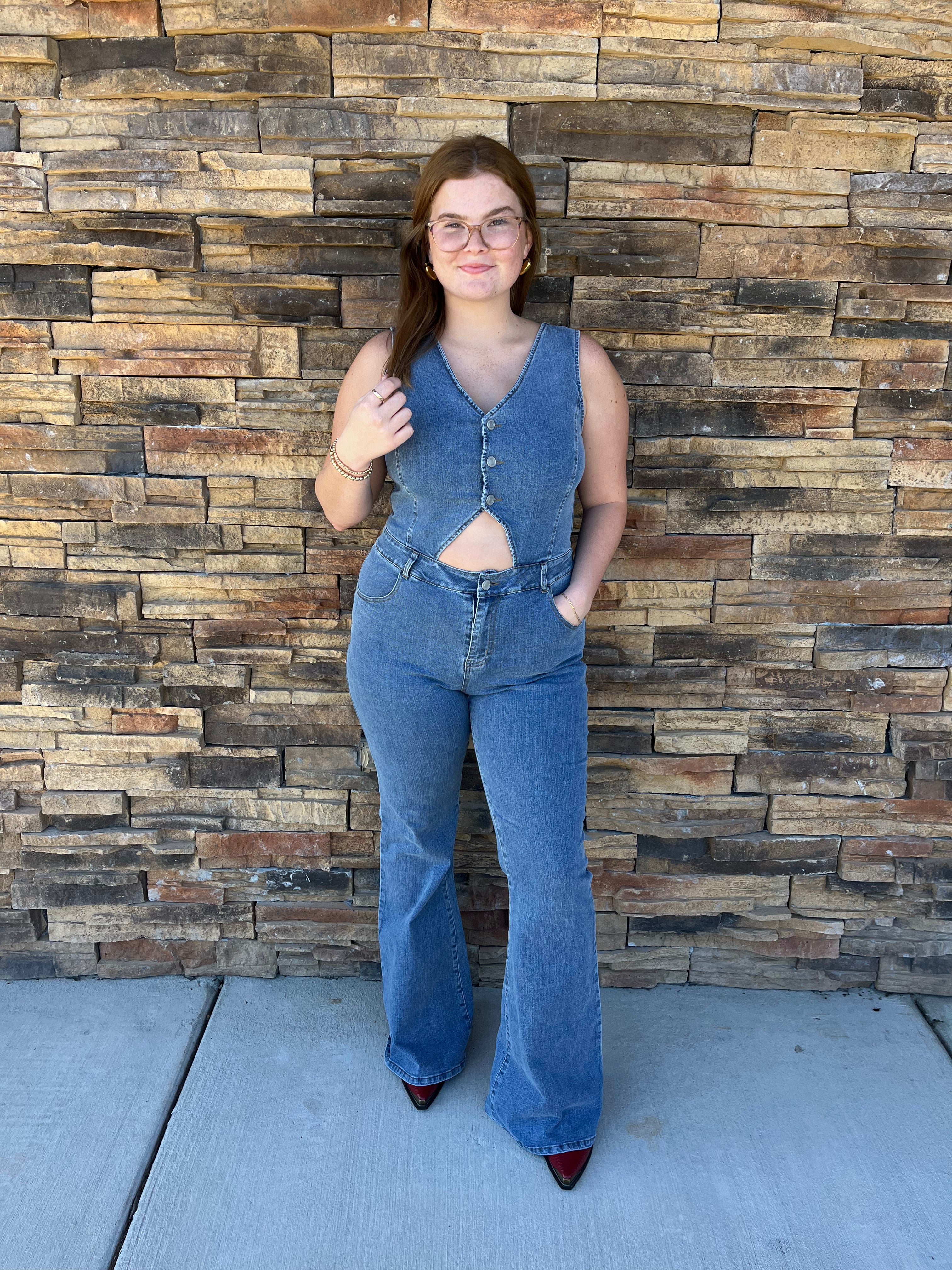 Who says jumpsuits have to be boring? Introducing the Clover Jumpsuit - a denim one-piece with a flirty cut out. Step up your style game with this fun and unique piece.