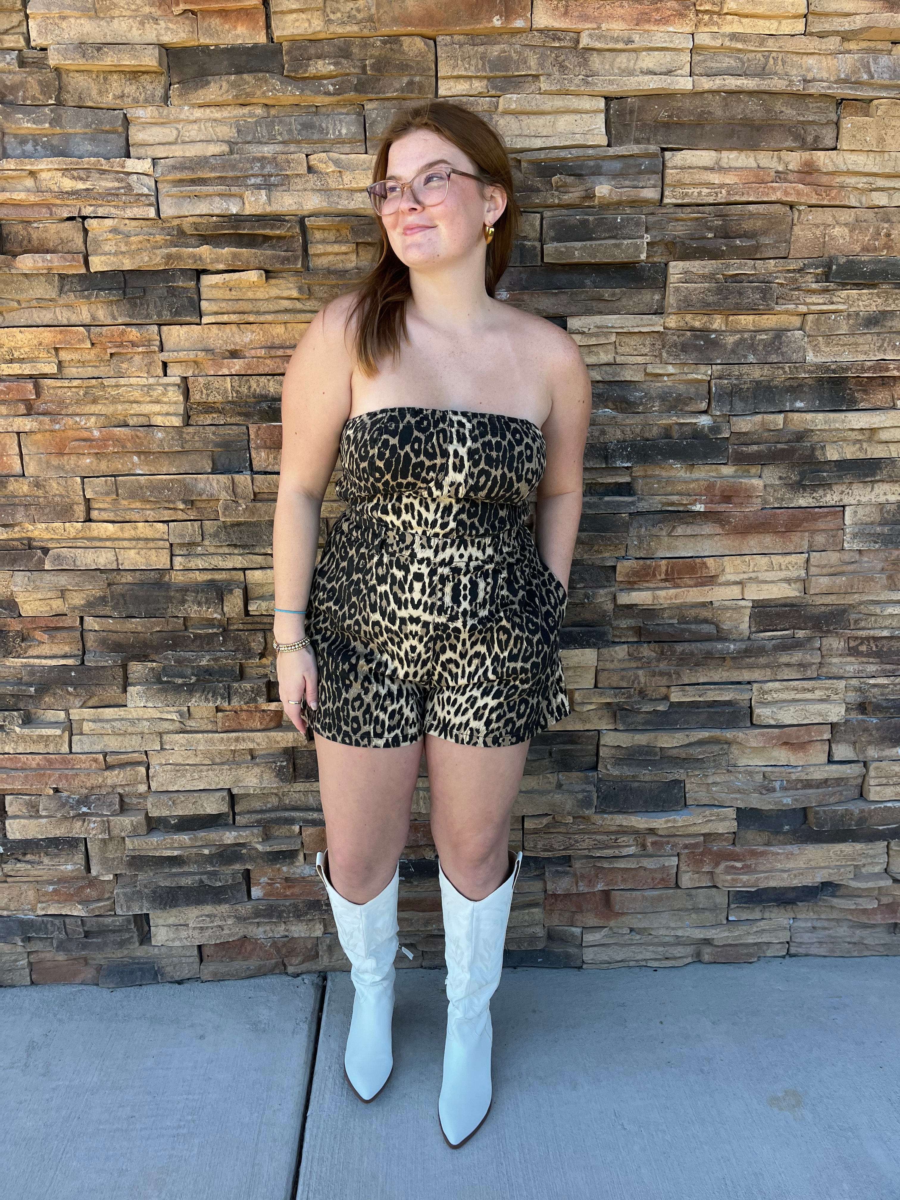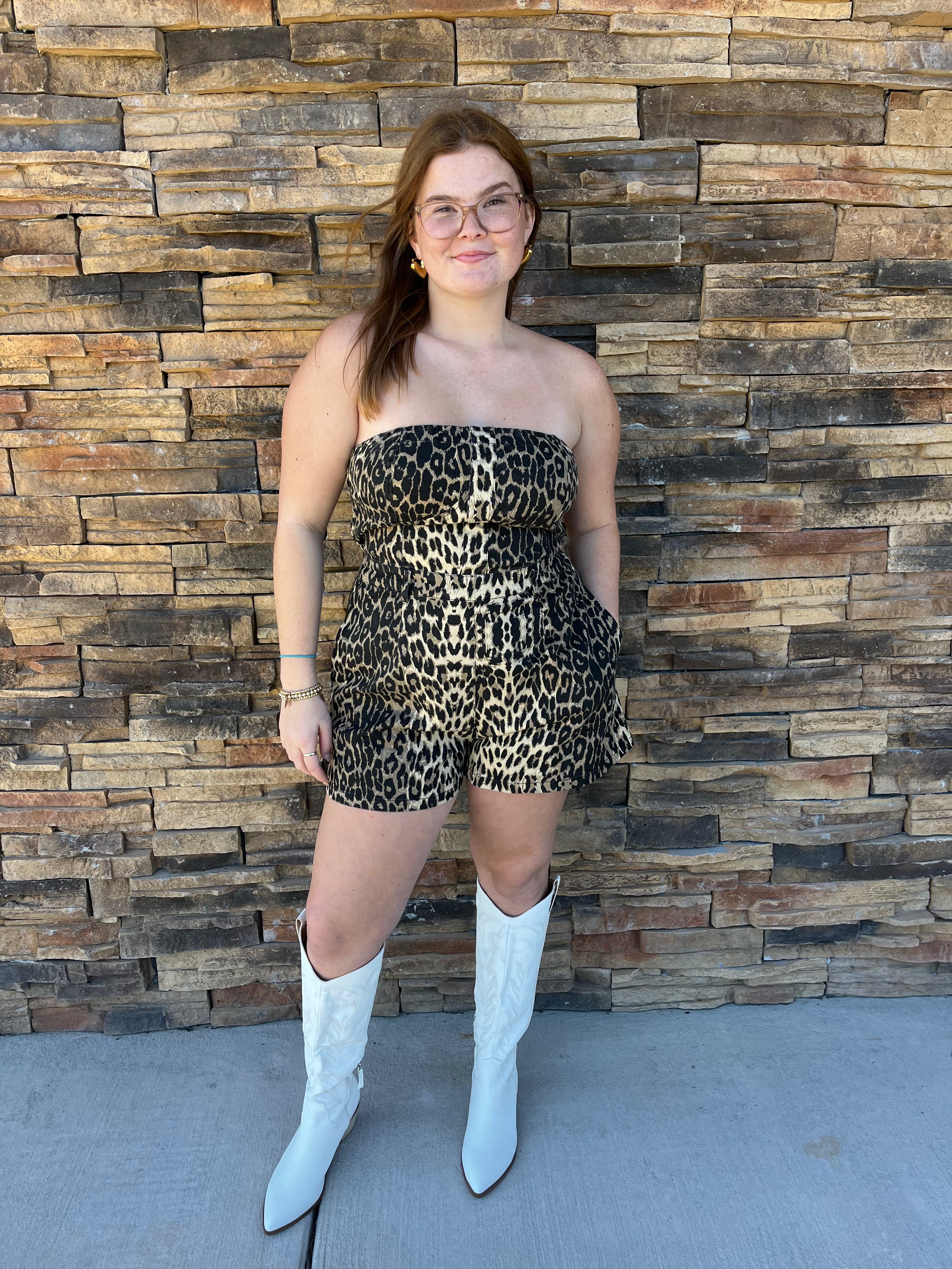 Be wild and stylish with the Leah Romper! This denim leopard print strapless romper will make you stand out in any crowd. Comfortable and chic, it's perfect for any occasion. Don't be afraid to show off your unique sense of fashion with this playful romper!
