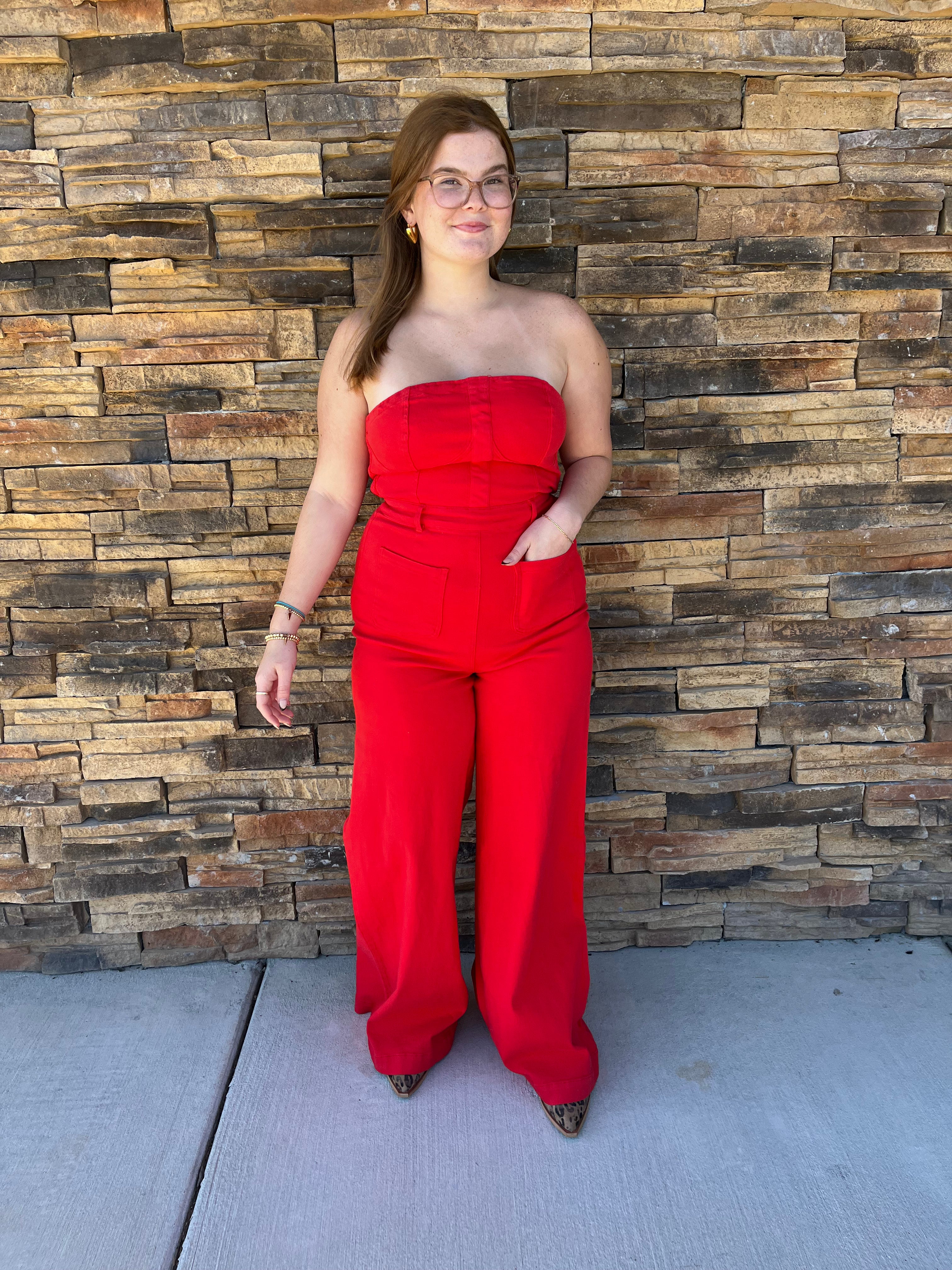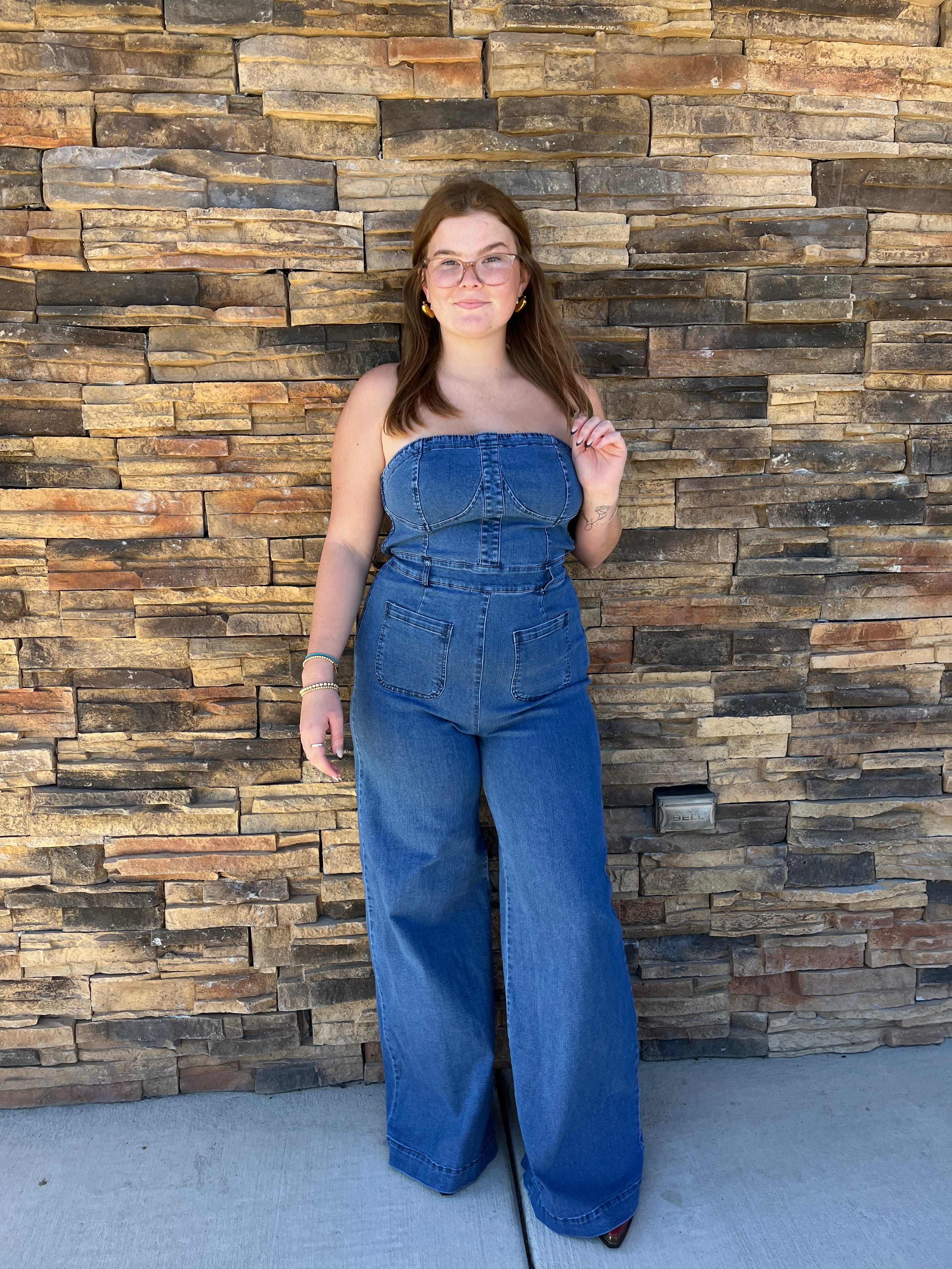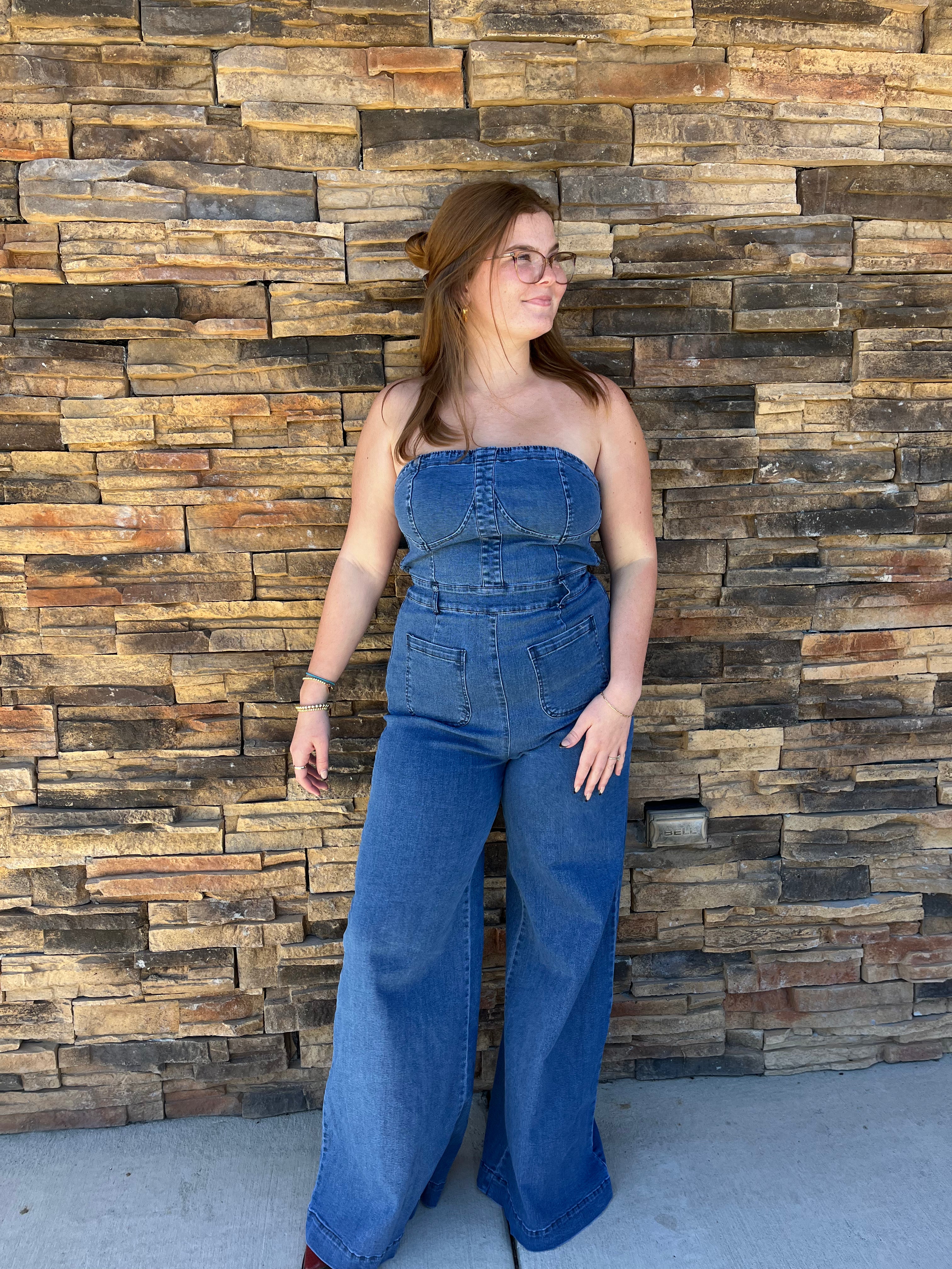 Wear this Sage Jumpsuit for a sleek and playful look. With its denim fabric and strapless design, you'll be comfortable and stylish all day long. Perfect for any occasion, this jumpsuit is a must-have for your wardrobe.