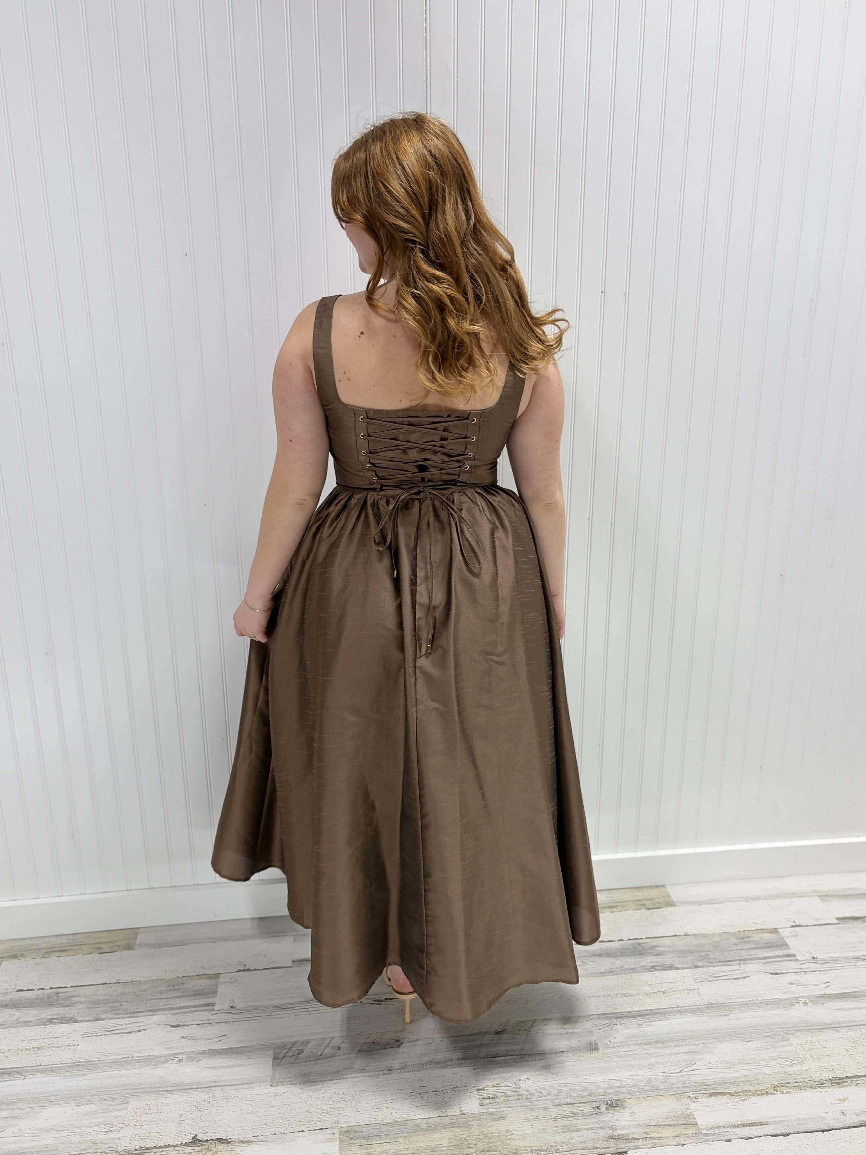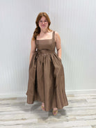 A solid woven midi dress featuring straight neckline, sleeveless, full skirt, back lace up detail and side zipper closure Details: Self : 100% Cotton Size & Fit - Model is 5`8" And Wearing Size Small - Measurements Taken From Size Small - Approx. Length: 54"