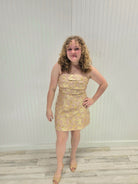 A textured woven mini dress featuring strapless neckline and back zipper closure Details: Self : 100% Polyester Lining : 100% Polyester Size & Fit - Model is 5`8" And Wearing Size Small - Measurements Taken From Size Small - Approx. Length: 29"