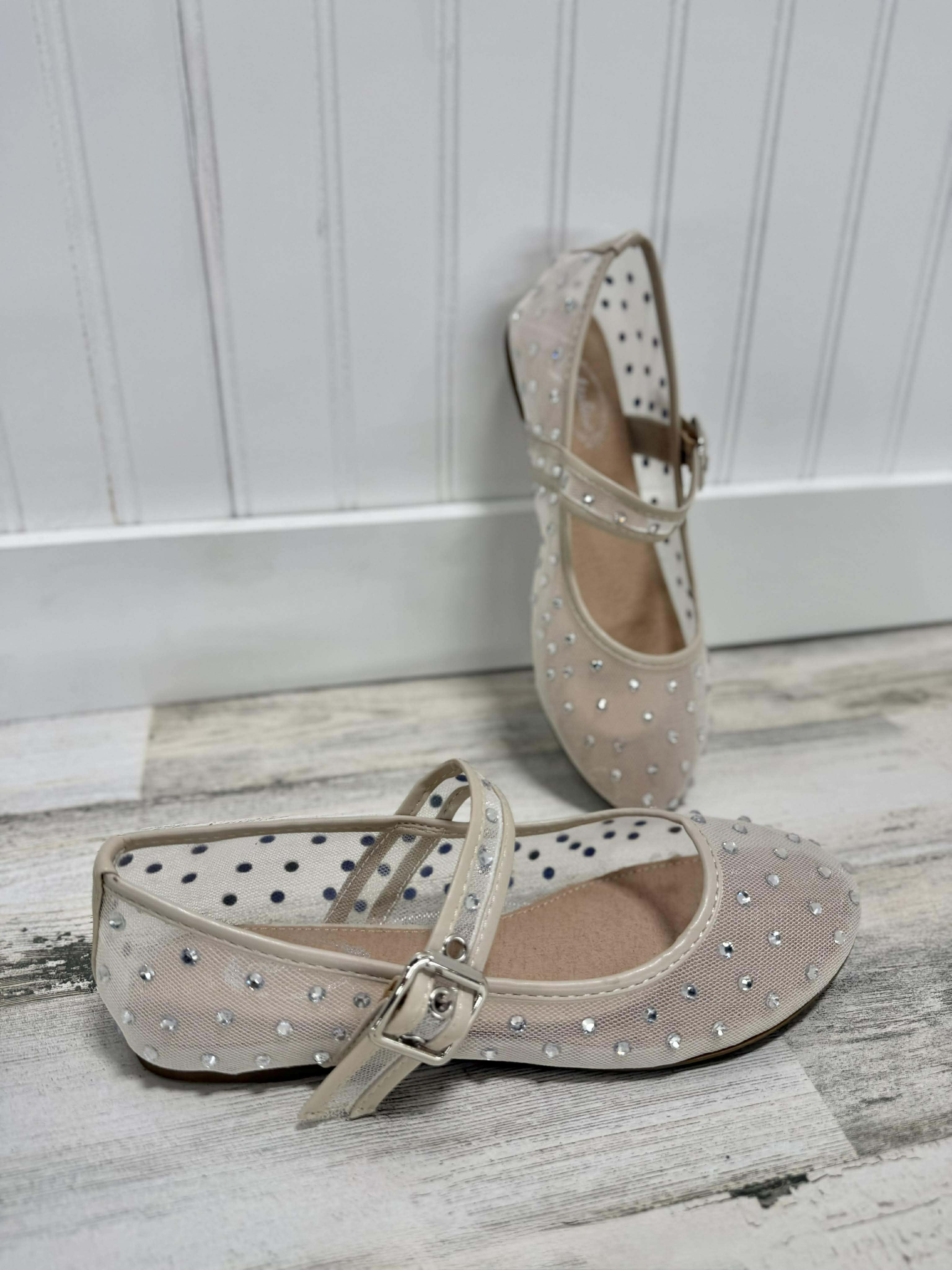 Flaunt your fun side in these darling sheer mesh Mary Janes that let your personality shine through—literally. Adorned with glittering rhinestone accents and featuring a stretchy elastic band across the instep for all-day comfort, these transparent beauties are the must-have flat that everyone's talking about this season. Bold, cheeky, and totally on-trend.
