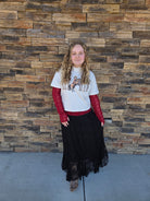 Introducing the Stevie Maxi Skirt - a playful addition to your wardrobe. This maxi skirt adds some fun to any outfit, with its quirky length and versatile style. Perfect for a day of exploring or a night out, the Stevie Maxi Skirt is a must-have for those who want to add a touch of humor to their everyday look!