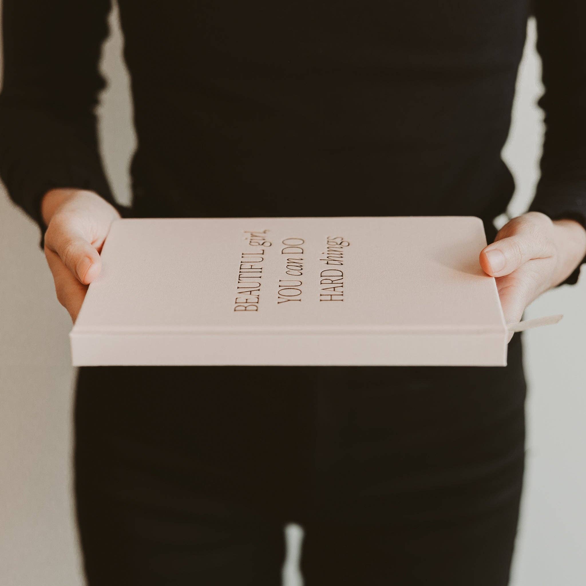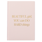 Attend your next meeting or class with a reminder that you are capable of anything. This stunning light pink journal features gold foil accents and 100 pages ready to be filled with your important notes, thoughts, and dreams. DETAILS: • Size: 8.1" x 5.6" x .6" • Design: Beautiful Girl, You Can Do Hard Things • Light Pink Fabric Journal with Gold Foil Details • 100gsm Uncoated Lined Paper • Ribbon Bookmark in Gold • 100 Pages Front and Back (200 Total)