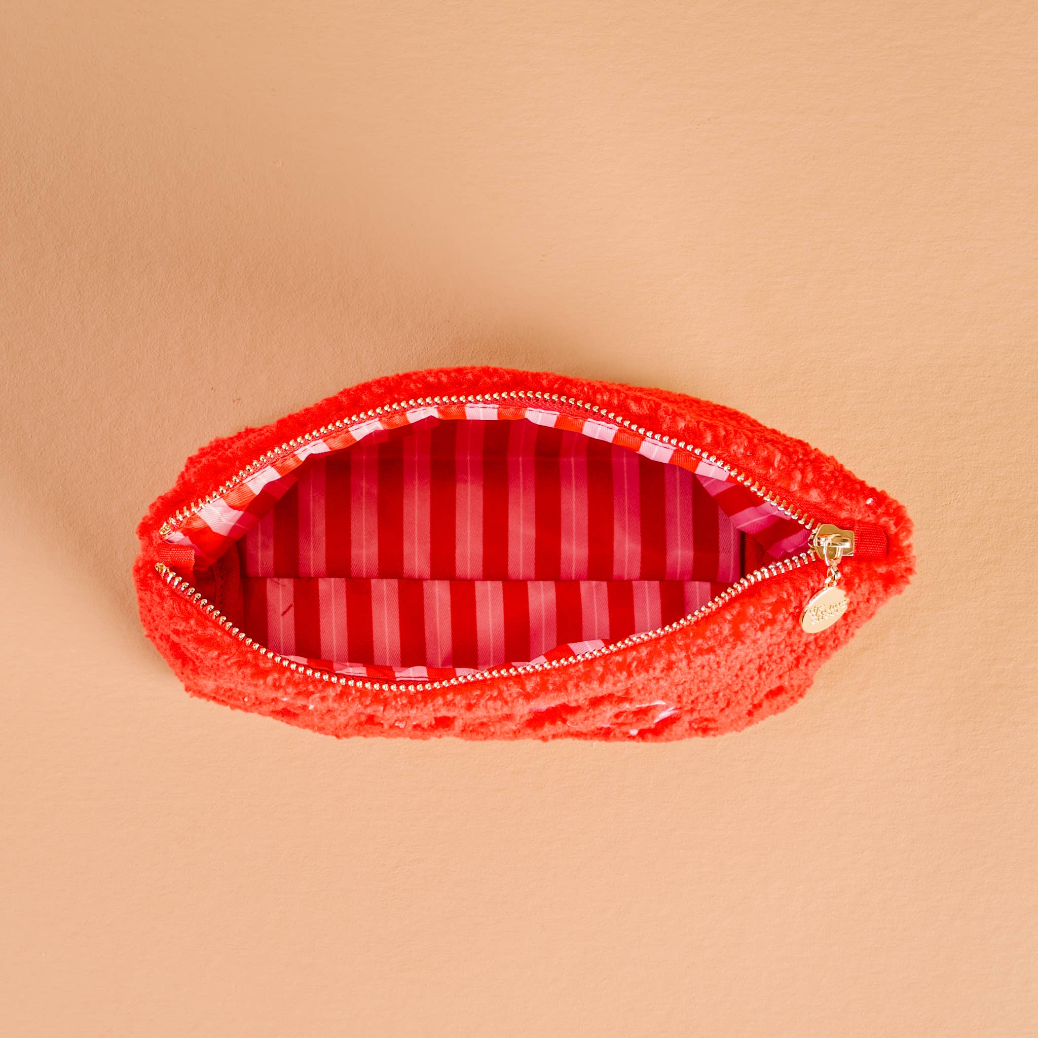 Keep your essentials safe, secure, and stylish in our festive Christmas Teddy Pouches. Perfect for cosmetics, travel, purse organization, and more. Stay stylish and efficient with this must-have accessory this season! Pair your rectangle teddy pouches with our coordinating circle and square teddy pouches, perfect for merchandising products together! Cozy sherpa fabric Wipeable lining Gold zipper and hardware Interior printed lining Rectangle size: 10" x 3.5" x 6"