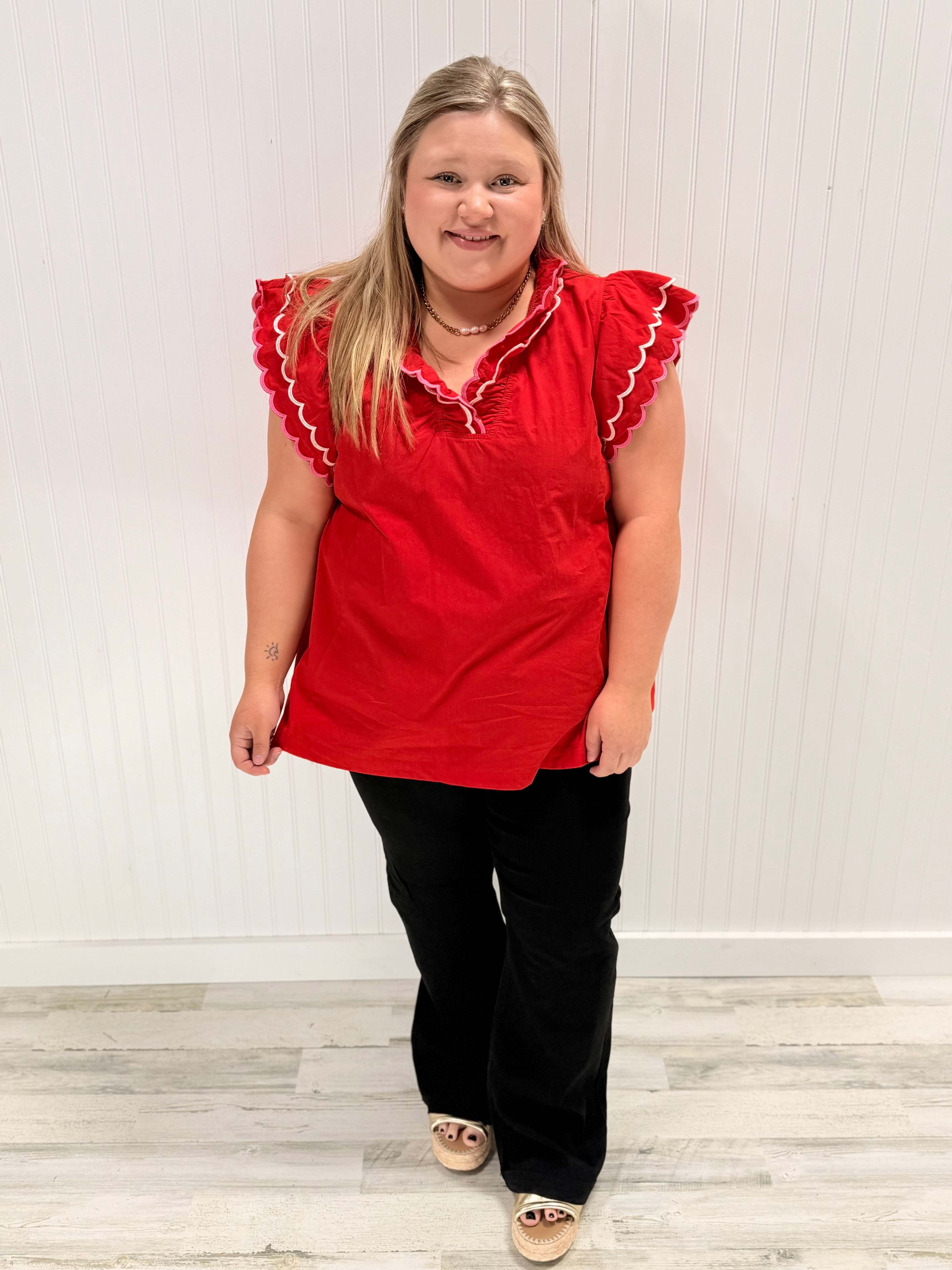 Curvy Sarah Top features statement ruffle sleeves and a flattering ruffled neckline with delicate scallop trim. Made from 100% cotton in a relaxed fit that's anything but boring.