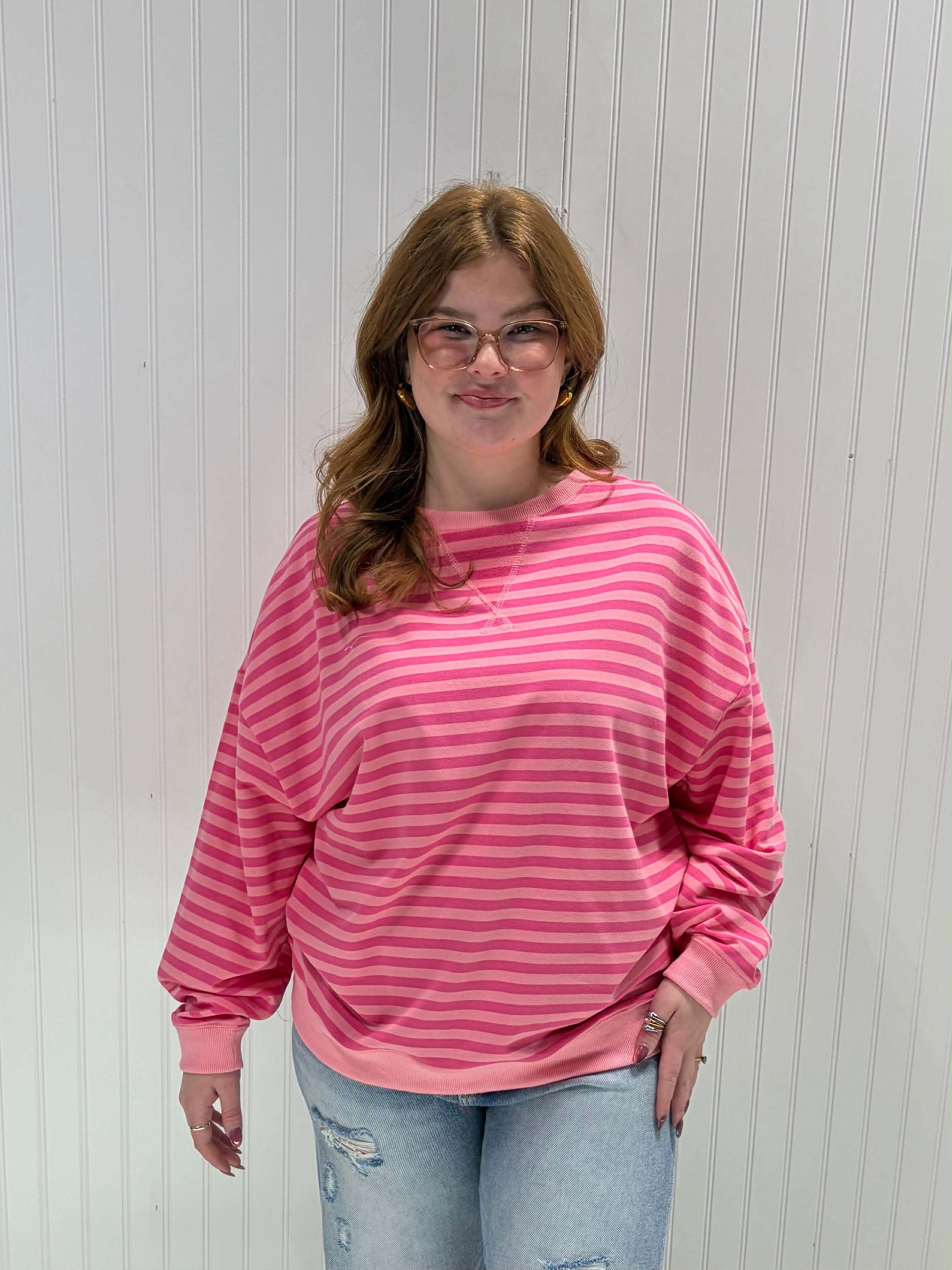 Strut into comfort with our Jasmine Top—an oversized striped sweatshirt that's equal parts cozy and cool. The relaxed fit drapes effortlessly over your frame, while bold stripes add visual interest to your everyday lineup. Perfect for layering or going solo, this wardrobe staple pairs with everything from jeans to joggers. Soft fabric keeps you feeling hugged all day long, making it your new go-to for casual vibes and weekend hangs.