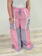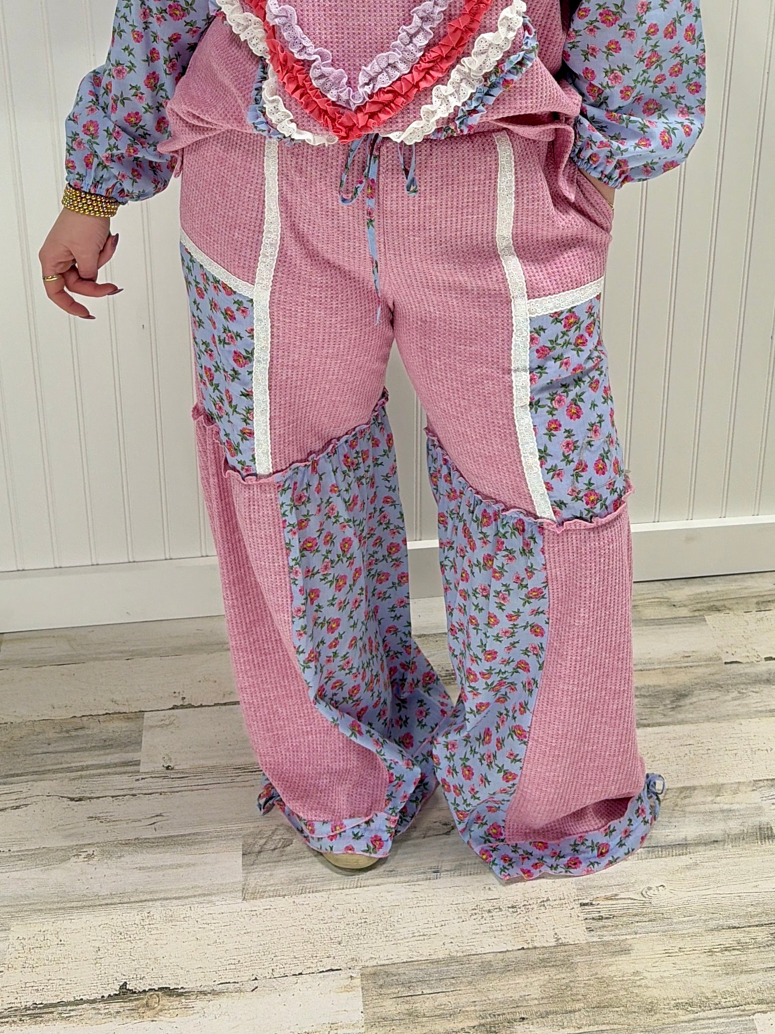 Soft patchwork lounge pants with mixed floral panels and lace trim. Features an adjustable drawstring waist and relaxed wide leg fit for cozy comfort with style. Perfect for pairing with the matching Nyla top.